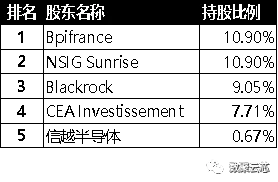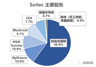 Soitec于1999年2月在巴黎泛欧证券交易所上市(ISIN:FR0013227113)。截止Soitec公司的最新披露(2021年3月),前五大股东分别为:Bpifrance(10.90%)、NSIG Sunrise(10.90%)、Blackrock(9.05%)、CEA Investissement(7.71%)、信越半导体(0.67%)。