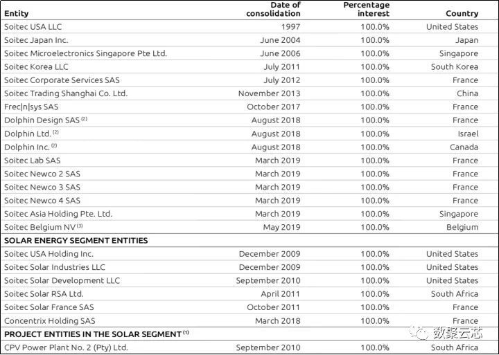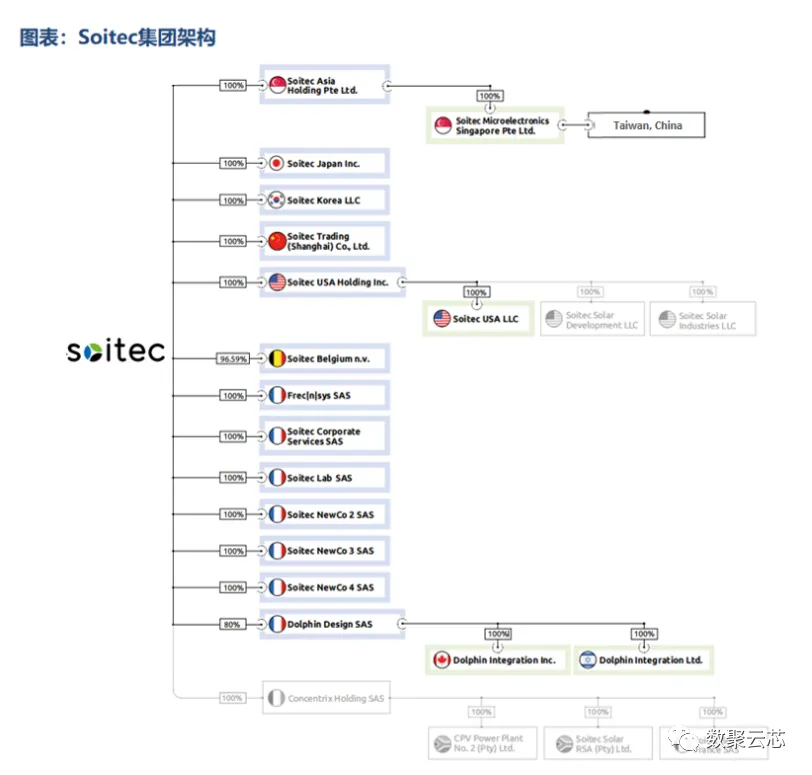 关于Soitec集团内部股权架构,Soitec公司作为集团母公司,下属统领多个子公司。具体信息如下图所示。
