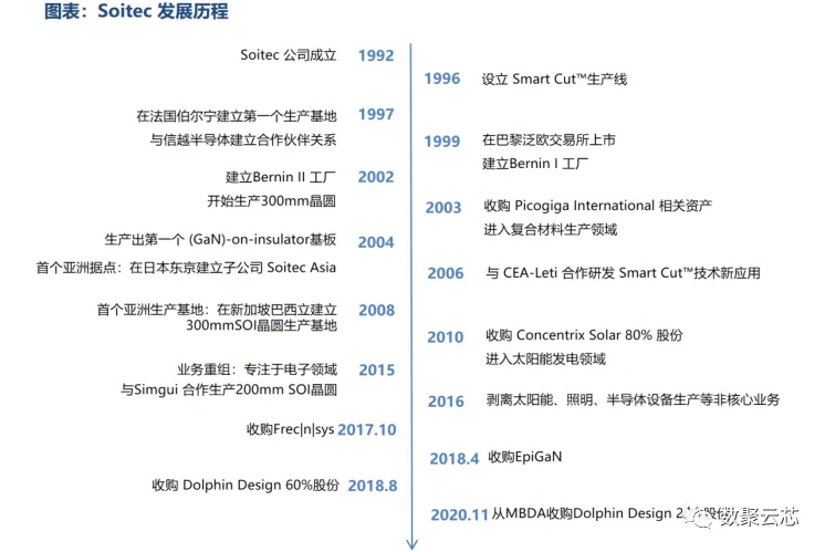 法国的Soitec作为全球第六大硅片供应商,承包了全球晶圆市场约6%的市场份额;与此同时,作为优化衬底这一细分市场的龙头,Soitec凭借以Smart Cut™工艺为代表的先进技术奠定了不可替代的市场地位。1992年成立至今,Soitec一直致力于技术研发创新,并通过并购细分市场优势企业的方式不断完善产品组合,力求为其下游芯片制造商提供提高产品性能、整合新功能以及降低功耗的解决方案。