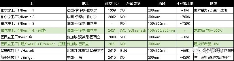 Soitec的主要晶圆制造产能集中在法国本土,此外在新加坡、比利时、中国都设立有海外生产基地。具体生产工厂及产品信息如下表所示。