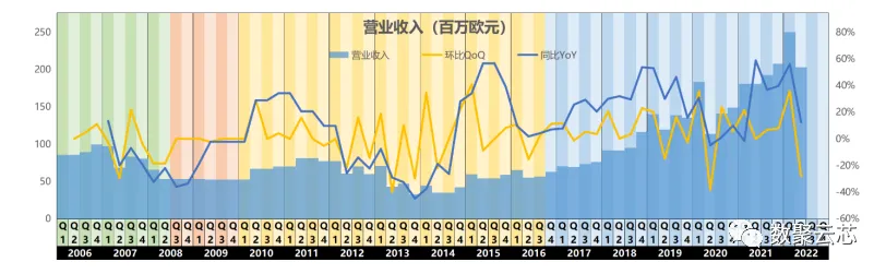 在以往的研究中,我们发现硅晶圆及其所属半导体行业均具有典型的周期性特征。虽然Soitec处于SOI晶圆这一细分市场,但其自身经营情况及供应链上下游仍不可避免受到行业周期波动的影响。因此,本部分将以周期性的视角,对Soitec的营收状况、毛利水平以及研发投入等方面进行分析,试图追踪其近十年业绩变动的趋势情况以及造成变化的可能原因。