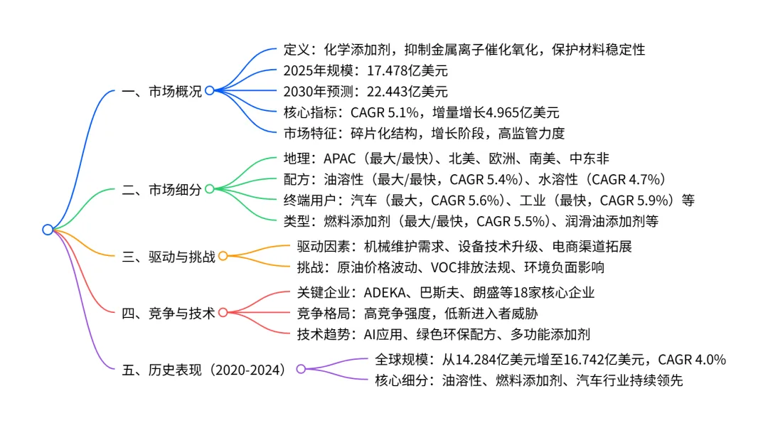 全球金属减活剂市场在 2025 年规模达 17.478 亿美元,2025-2030 年将以 5.1% 的 CAGR 增长至 22.443 亿美元,增量增长 4.965 亿美元;市场呈碎片化竞争格局,APAC是最大且增长最快的区域(贡献 38.5% 增量增长),油溶性产品(占 63.9% 市场份额)、燃料添加剂类型(占 59.4% 市场份额)和汽车行业(占 33.0% 市场份额)为核心细分领域;驱动因素包括机械可靠性需求提升、设备技术升级及电商渠道拓展,同时面临原油价格波动、VOC 排放法规收紧及环境影响等挑战,AI 技术在产品研发、生产效率等方面的应用逐步深化。