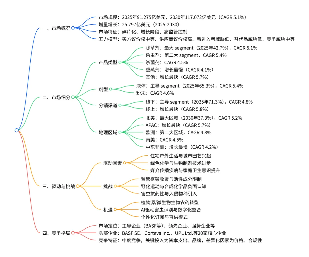 2025-2030 年全球家居和园艺杀虫剂市场呈现加速增长态势,2025 年市场规模达91.275 亿美元,预计 2030 年将增至117.072 亿美元,增量增长25.797 亿美元,CAGR 为5.1%;市场结构呈碎片化,北美是最大区域市场(2030 年占比 37.3%),APAC是增长最快区域(CAGR 5.7%);产品类型中除草剂占比最高(2025 年 42.7%),其他类产品(含生物农药等)增长最快(CAGR 5.7%);剂型以液体为主(2025 年占比 65.3%),分销渠道中线下仍占主导但线上增长更快(CAGR 5.8%);驱动因素包括住宅户外生活兴起、绿色化学技术进步等,面临监管收紧、害虫抗药性等挑战,头部企业有 BASF SE、Corteva Inc. 等,市场竞争以中度竞争为主。