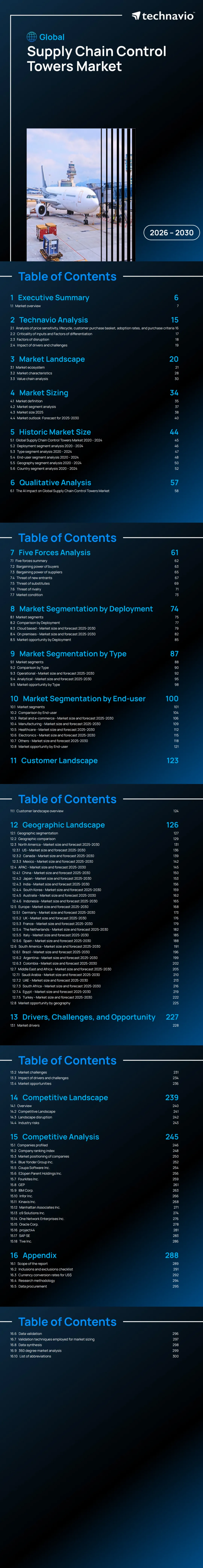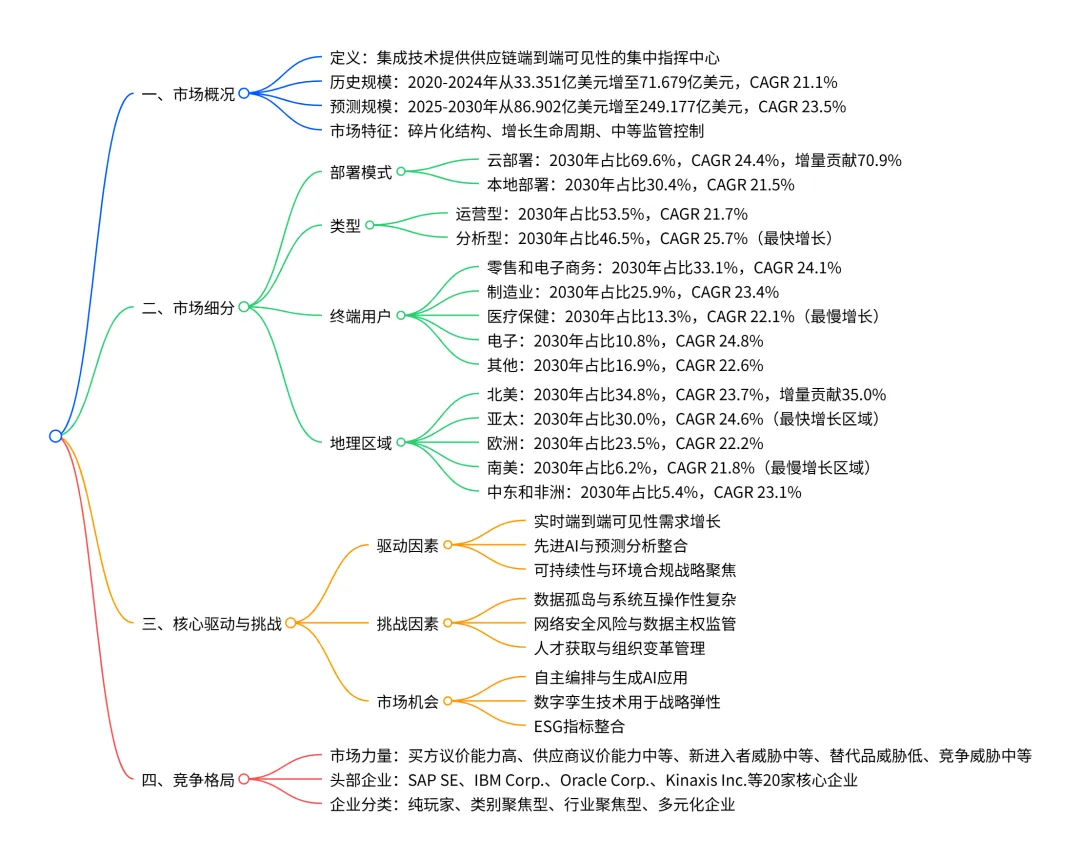 全球供应链控制塔市场在 2025-2030 年呈现加速增长态势,2025 年市场规模为 86.902 亿美元,预计 2030 年将达 249.177 亿美元,CAGR 达 23.5%,增量增长 162.275 亿美元;市场结构呈碎片化,以北美为最大区域市场(2030 年占比 34.8%)、云部署为主要部署模式(2030 年占比 69.6%)、零售和电子商务为核心终端用户(2030 年占比 33.1%),AI 与预测分析的整合、实时端到端可见性需求增长为主要驱动因素,同时面临数据孤岛、网络安全风险等挑战,头部企业包括 SAP SE、IBM Corp.、Oracle Corp. 等,市场竞争态势温和。