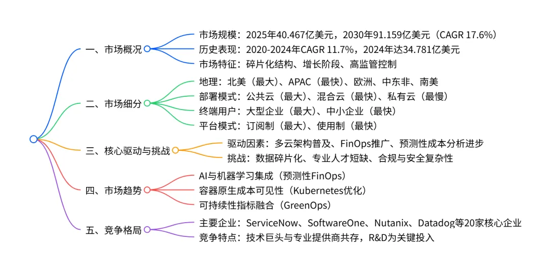 全球多云成本智能平台市场在 2025-2030 年呈现加速增长态势,2025 年市场规模达 40.467 亿美元,2030 年预计增至 91.159 亿美元,CAGR 为 17.6%,增量增长 50.692 亿美元;市场呈碎片化竞争格局,北美是最大区域市场(2030 年占比 33.4%),APAC 为增长最快区域(CAGR 18.9%);部署模式中公共云占比最高(2025 年 48.2%),混合云增长最快(CAGR 18.9%);终端用户以大型企业为主(2025 年占比 70.5%),中小企业增长更迅猛(CAGR 18.6%);平台模式中订阅制占主导(2025 年 65.5%),使用制增长更快(CAGR 18.8%);核心驱动因素包括多云架构普及、FinOps 框架推广及预测性成本分析技术进步,主要挑战为数据碎片化、专业人才短缺及合规复杂性,AI 集成、容器化成本可见性及 GreenOps 融合成为关键趋势。