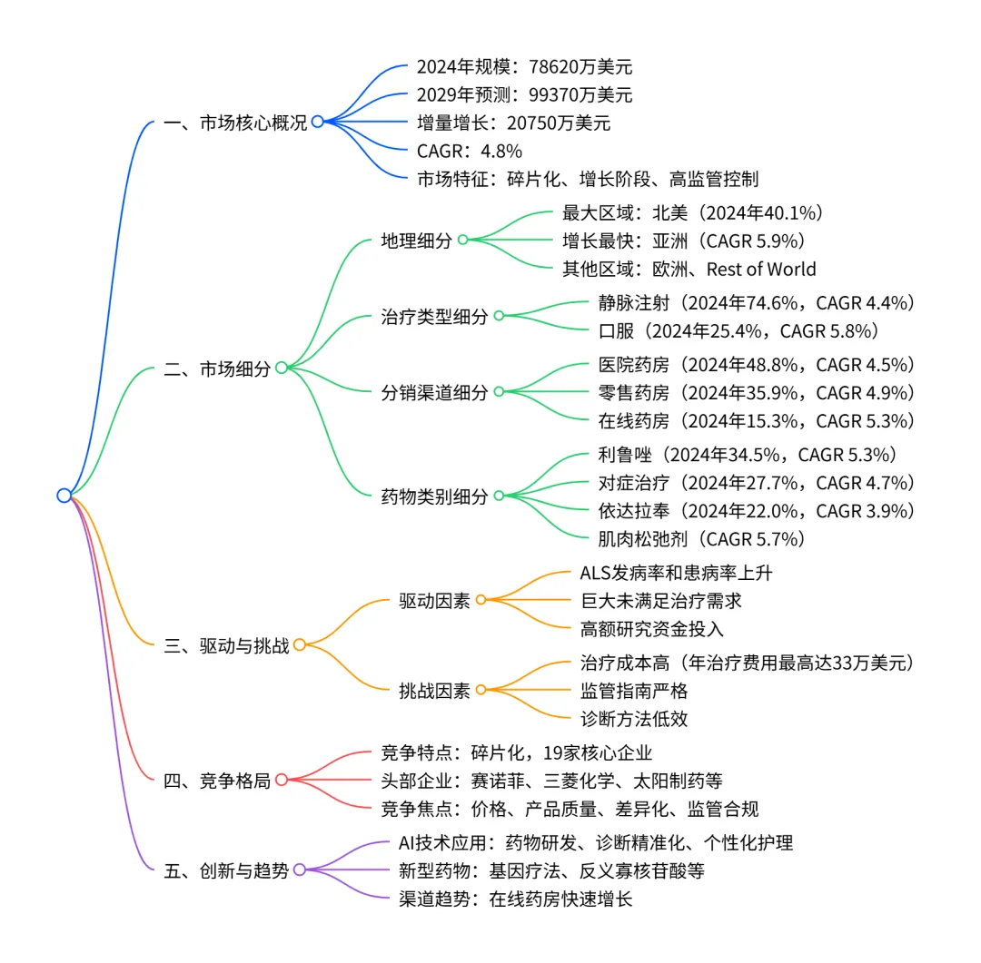 全球肌萎缩侧索硬化症(ALS)治疗市场在 2024 年规模达 78620 万美元,预计 2029 年将增长至 99370 万美元,年复合增长率(CAGR)4.8%,增量增长 20750 万美元;市场呈碎片化竞争格局,北美为最大市场(2024 年占比 40.1%),亚洲为增长最快区域(CAGR 5.9%);治疗类型上,静脉注射占主导(2024 年市场份额 74.6%)但口服制剂增长更快(CAGR 5.8%),分销渠道以医院药房为主(2024 年占比 48.8%),药物类别中利鲁唑(Riluzole)是核心品类(2024 年占比 34.5%),肌肉松弛剂增长最快(CAGR 5.7%);市场增长受 ALS 发病率上升、未满足治疗需求及高额研究资金驱动,但面临治疗成本高、监管严格等挑战,AI 技术在药物研发和诊断中的应用成为重要创新方向。