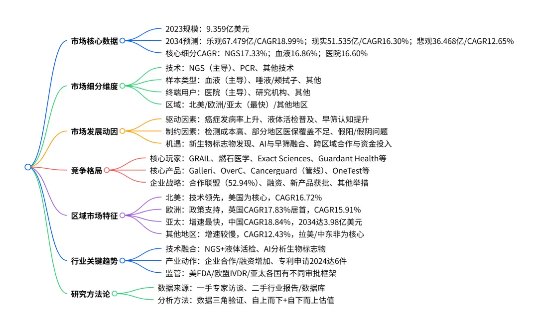 这份由 BIS Research 发布的 2024-2034 年全球多癌早期检测(MCED)市场分析报告,核心聚焦技术、样本类型、终端用户和区域四大维度,指出 2023 年市场规模达9.359 亿美元,现实情景下 2034 年将达 51.535 亿美元、CAGR 为 16.30%,NGS 技术、血液样本、医院分别为各细分领域主导者,亚太地区将成增速最快区域(CAGR17.79%);市场驱动因素包括癌症发病率上升、液体活检普及、早筛认知提升,高检测成本为主要制约,新生物标志物发现和 AI 融合是核心机遇;竞争格局高度市场化,GRAIL、燃石医学、Exact Sciences 等为核心玩家,2022-2025 年企业战略以合作联盟(52.94%)为主要方向,同时全球各区域因医疗基础、政策资金差异呈现不同的市场发展特征与机遇挑战。