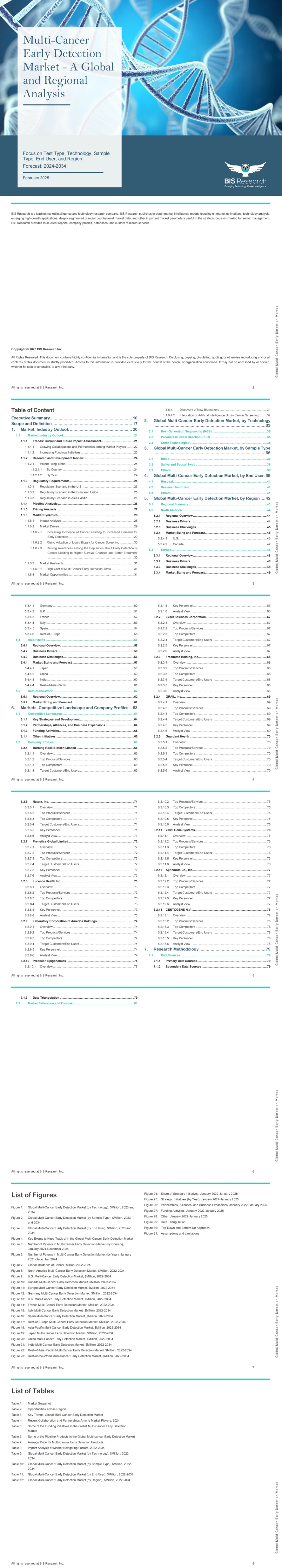 本报告为 BIS Research2025 年发布的2024-2034 年全球多癌早期检测(MCED)市场分析报告,从市场规模、细分维度、发展动因、区域特征、竞争格局、行业趋势等多方面展开,结合一手 + 二手数据与专业分析,为市场战略决策提供依据,以下为核心内容分点总结: