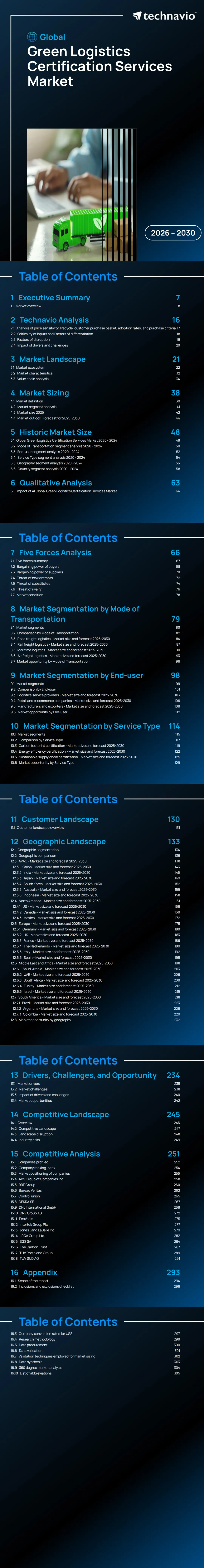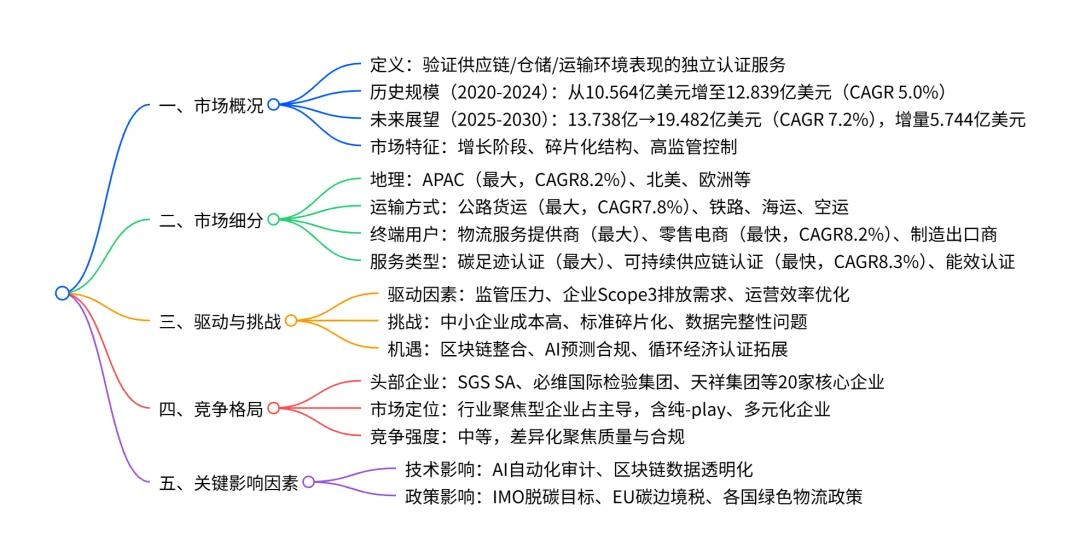 全球绿色物流认证服务市场在 2025-2030 年将保持7.2% 的 CAGR加速增长,市场规模从 2025 年的13.738 亿美元增至 2030 年的19.482 亿美元,增量达5.744 亿美元;APAC 地区是最大且增长最快的区域(CAGR 8.2%),公路货运物流为核心细分领域(占 2025 年市场份额 50.2%,增量贡献 54.5%),零售和电子商务公司(CAGR 8.2%)及可持续供应链认证(CAGR 8.3%)是增长最快的终端用户和服务类型;市场驱动因素包括监管压力、企业 Scope 3 排放透明化需求及运营效率优化,同时面临中小企业成本压力、标准碎片化等挑战,头部企业以 SGS SA、必维国际检验集团等为主,市场呈碎片化竞争格局。