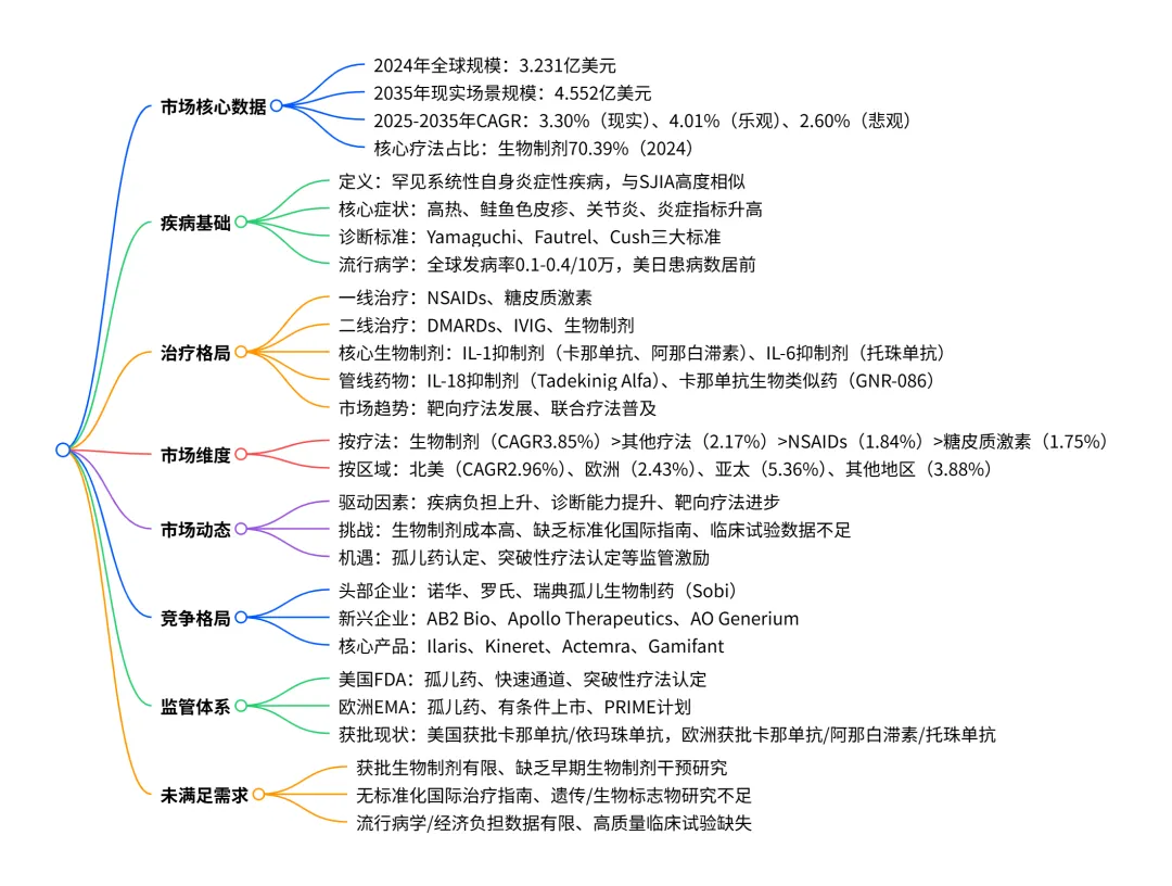 这份由 BIS Research 发布的 2025-2035 年成人斯蒂尔病(AOSD)全球及区域市场分析报告,聚焦疗法与区域维度展开预测,指出2024 年全球市场规模达3.231亿美元,2035年现实场景下将增至4.552亿美元,CAGR为 3.30%;生物制剂是市场核心增长动力(2024年占比70.39%,2025-2035年CAGR 3.85%),IL-1/IL-6抑制剂为核心品类,且联合疗法、靶向疗法成为主流趋势;区域方面北美为最大市场(2024 年占比 36.81%),亚太地区增长最快(CAGR 5.36%);市场驱动因素包括疾病负担上升、诊断能力提升,核心挑战为生物制剂成本高昂,而孤儿药认定等监管激励成为重要机遇;竞争格局由诺华、罗氏、瑞典孤儿生物制药(Sobi)等头部企业主导,同时 AB2 Bio、Apollo Therapeutics 等企业的管线药物(如IL-18抑制剂)为市场注入新活力,目前临床中仍存在诊断标准多样、临床试验数据不足等未满足医疗需求。