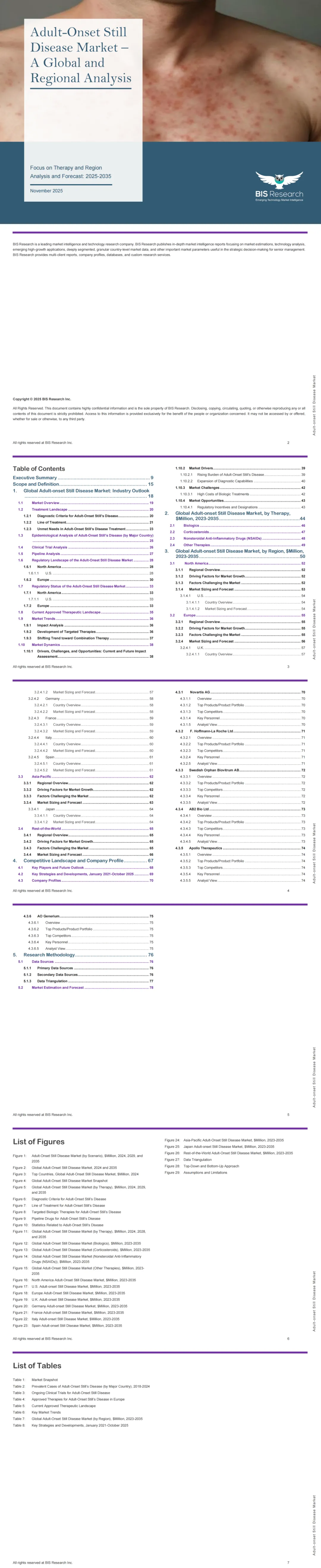 本报告为 BIS Research 发布的2025-2035 年成人斯蒂尔病(AOSD)全球及区域市场分析报告,以 2024 年为基准年,从疾病基础、治疗格局、市场规模、区域分析、市场动态、竞争格局、监管体系等维度展开全面研究,核心结论与细节如下: