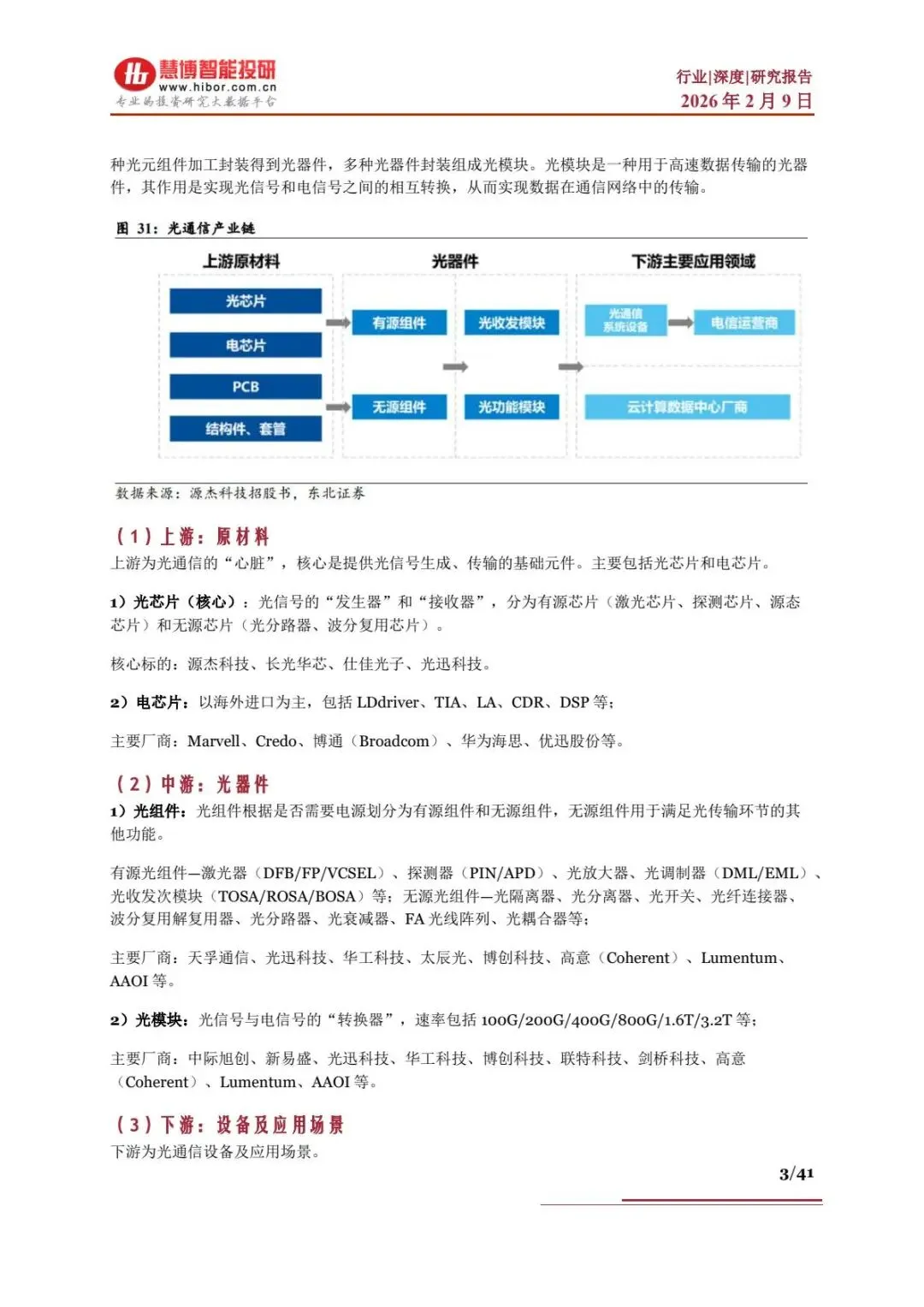 产业链呈上游原材料 - 中游光器件 - 下游设备及应用的垂直结构,价值核心向光、电芯片集中,形成 “芯片定性能、封装定可靠性” 的格局。