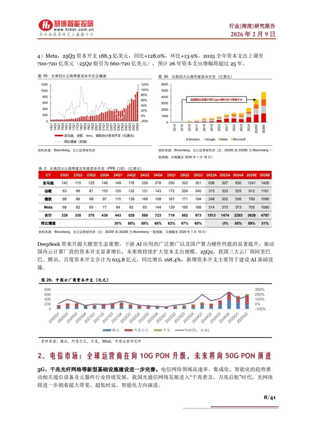 - 光纤接入升级:截至 2025 年 9 月,国内千兆宽带用户2.35 亿户(占比 33.9%),10G PON 端口3096 万个,同比 + 13.32%;全球向 10G PON 升级,未来 50G PON 端口 2024-2028 年CAGR200%。
