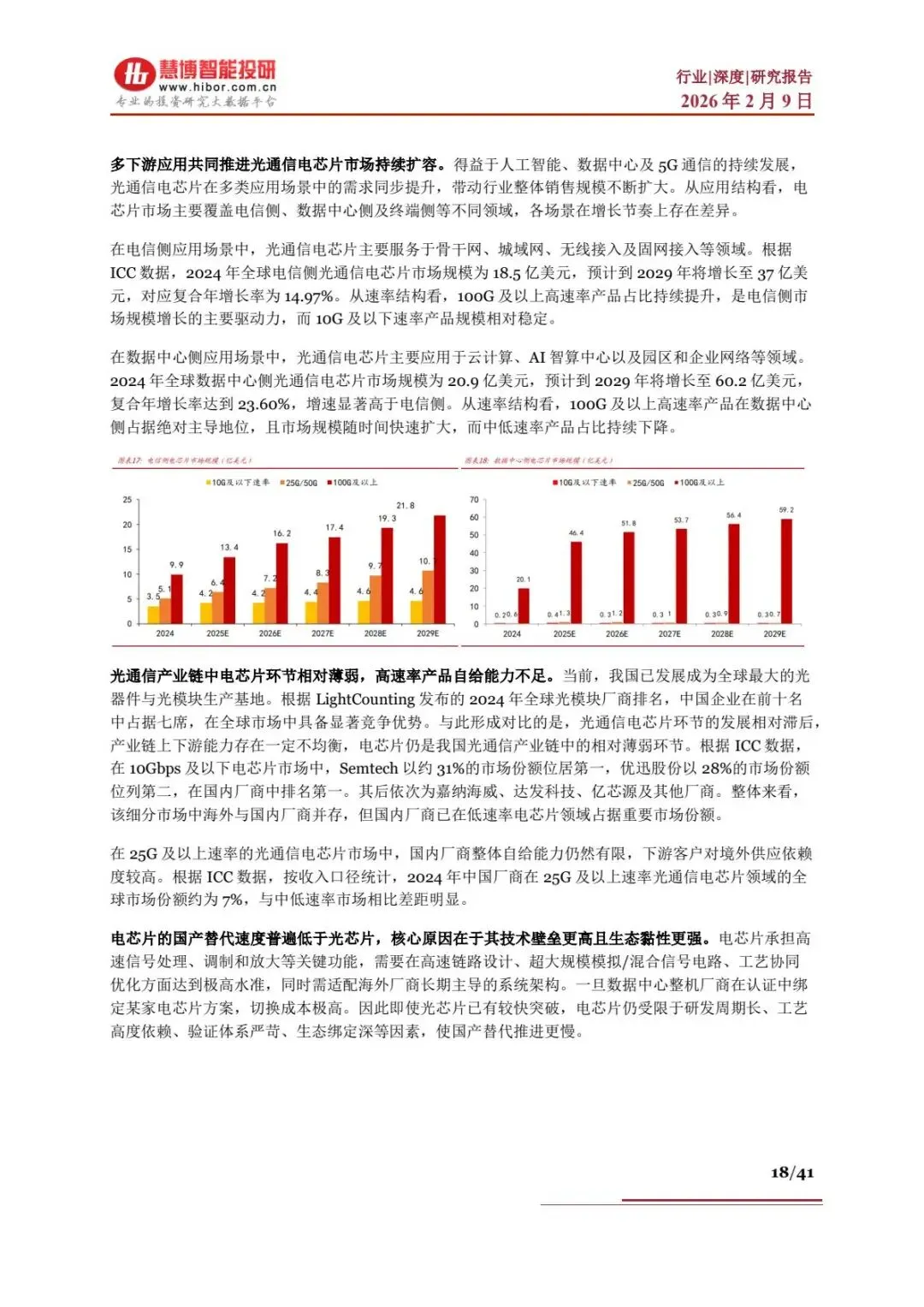 | 电芯片 | 海外垄断(Macom、Semtech),高端技术壁垒高 | 10G 及以下国内占 28%(优迅股份),25G 及以上全球份额仅7% | |