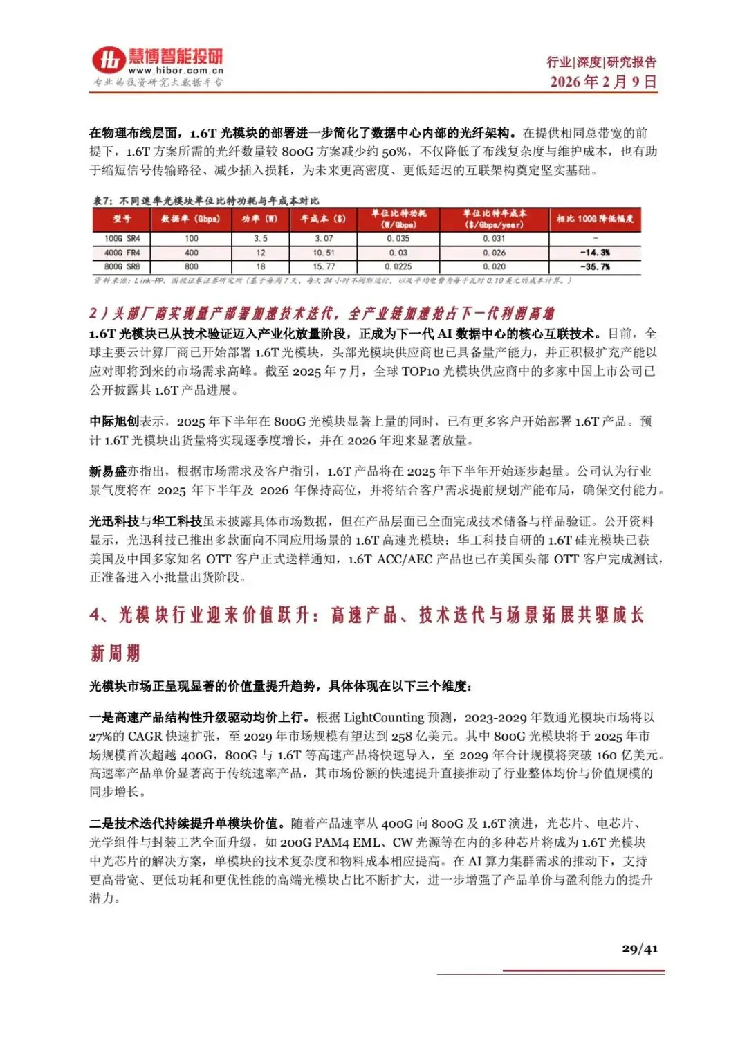 - 演进主线:一是高速光模块商用,1.6T/3.2T 产品加速落地,硅光、CPO 等前沿技术突破;二是国产替代深化,国内从封装制造向光芯片、电芯片等高价值环节攀升。
