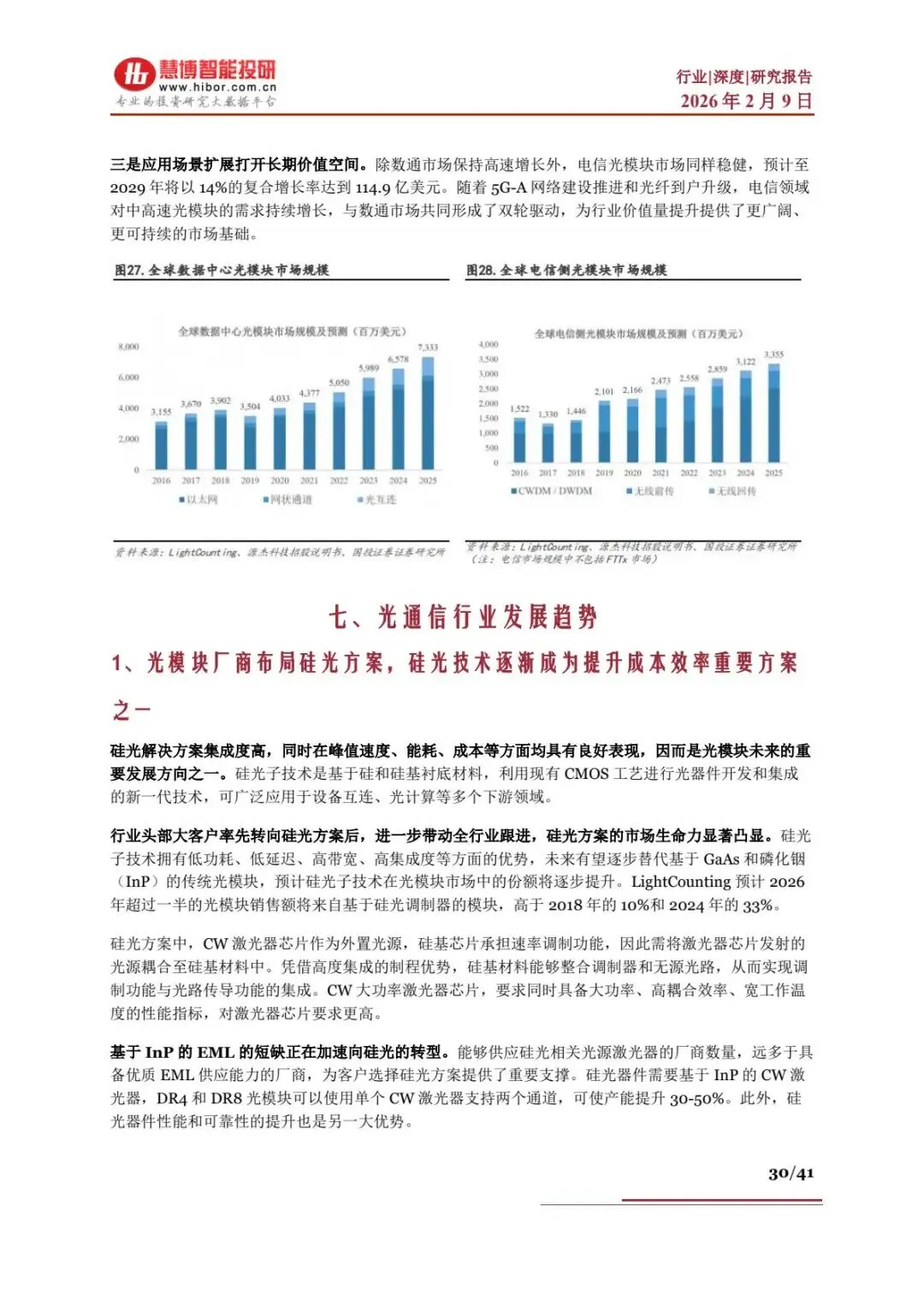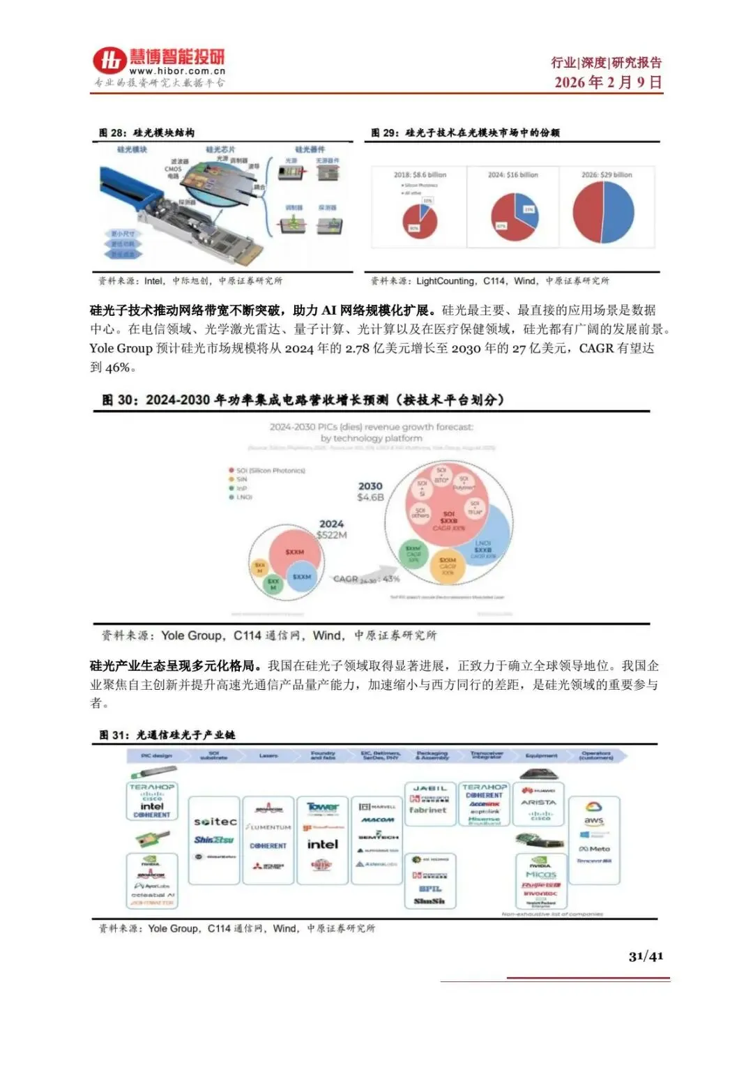 - 优势:低功耗、高集成度、低成本,可替代传统 GaAs / 磷化铟光模块,2026 年超 50% 光模块销售额来自硅光方案。