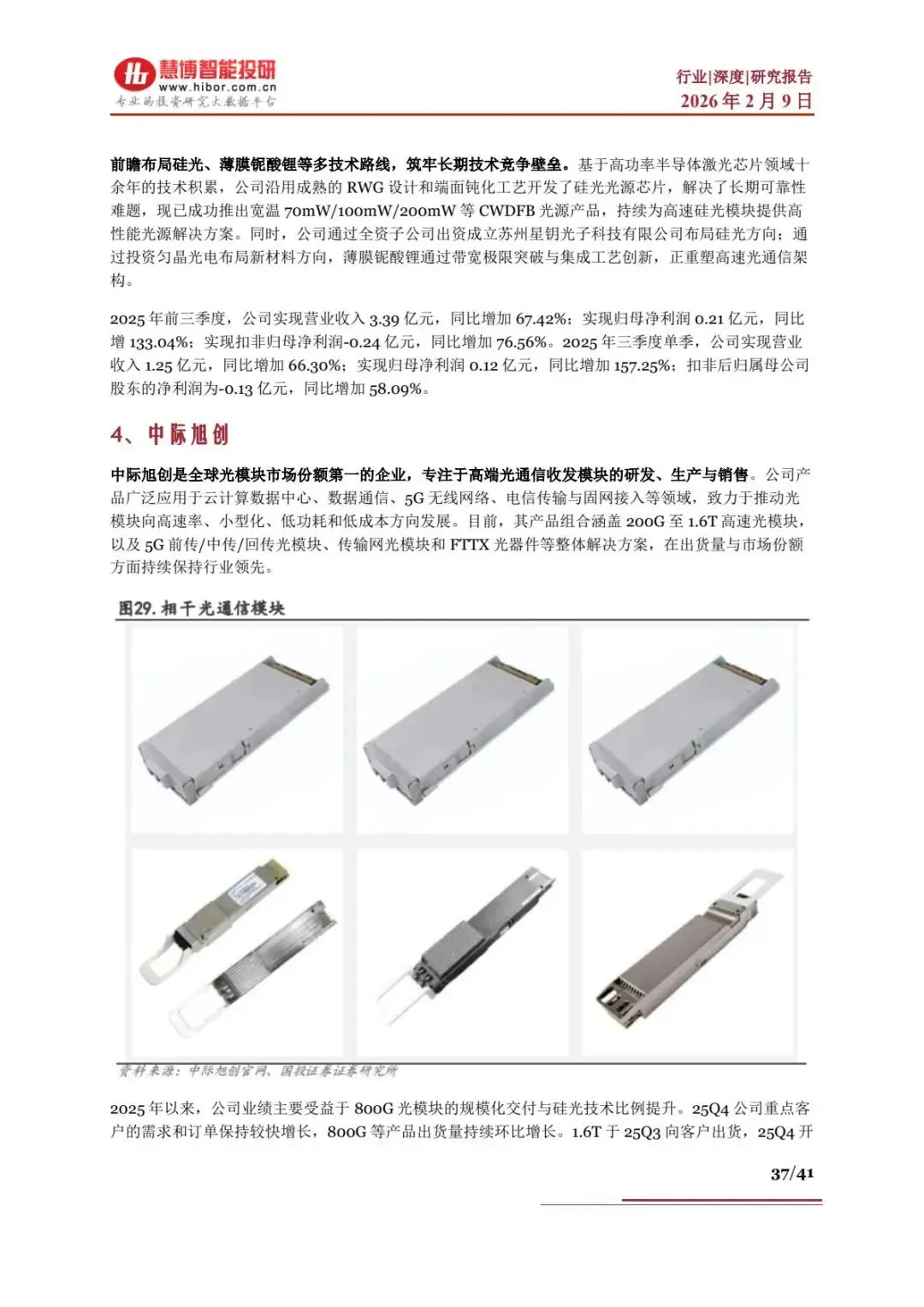 - 中际旭创:全球市场份额第一,800G 放量,1.6T 25Q3 出货,25Q4 归母净利润中值36.7 亿元,同比 + 158.63%,布局 CPO/OCS 技术。