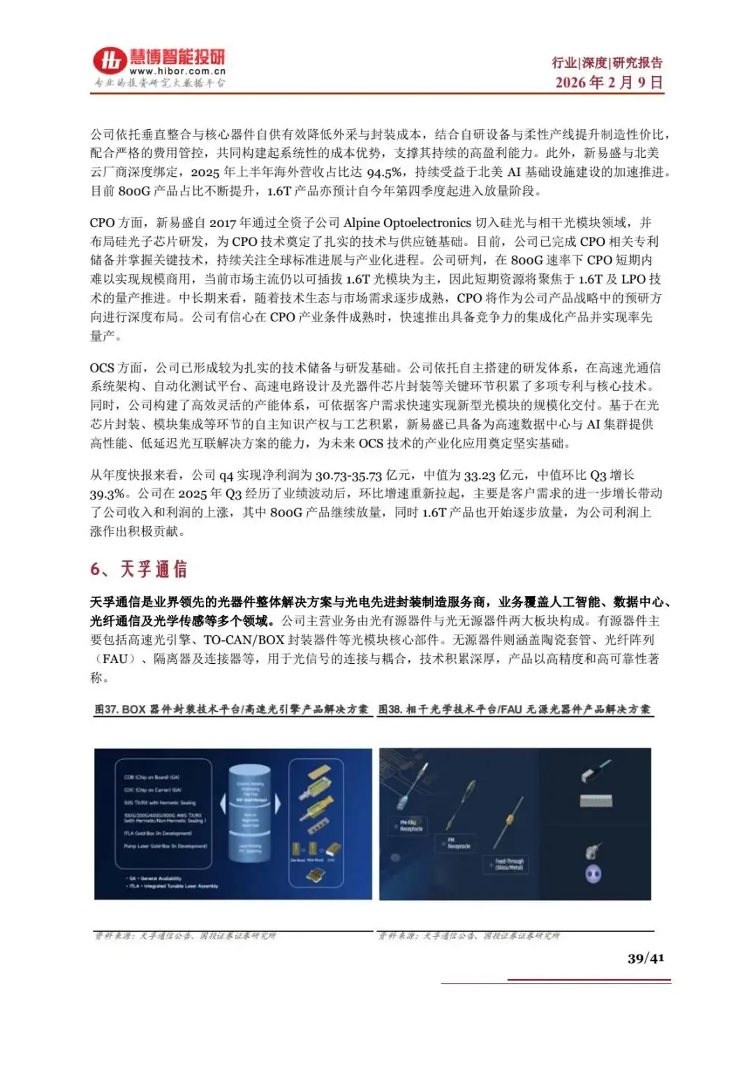 - 新易盛:800G 占比提升,1.6T 25Q4 起量,海外营收占比 94.5%,25Q4 净利润中值33.23 亿元,环比 + 39.3%,掌握 CPO 核心专利。