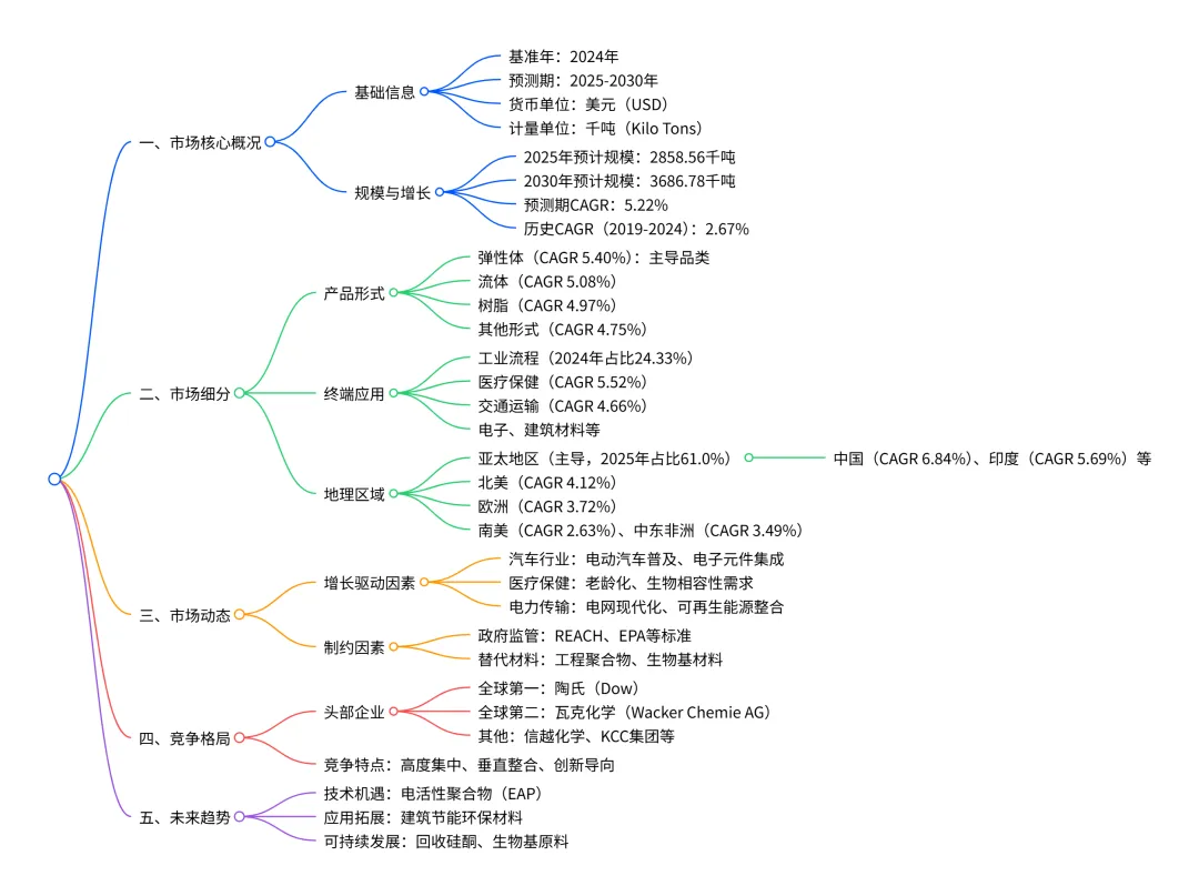 全球硅酮市场在2025年预计规模达2858.56千吨,2030 年将增长至3686.78千吨,年复合增长率5.22%,其中亚太地区以61.0%的2025年预计市场份额占据主导地位,弹性体是最主要的产品形式(2024年体积占比49.63%),工业流程为最大终端应用领域(2024年体积占比24.33%);市场增长主要受汽车(尤其是电动汽车)、医疗保健、电力传输与分配三大行业需求驱动,但面临政府监管严格化、替代材料竞争的制约,竞争格局呈现高度集中态势,陶氏(Dow) 为全球领先企业,未来趋势聚焦于电活性聚合物(EAP)应用拓展及建筑领域的节能环保硅酮材料研发。