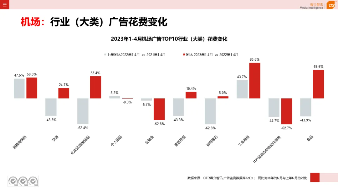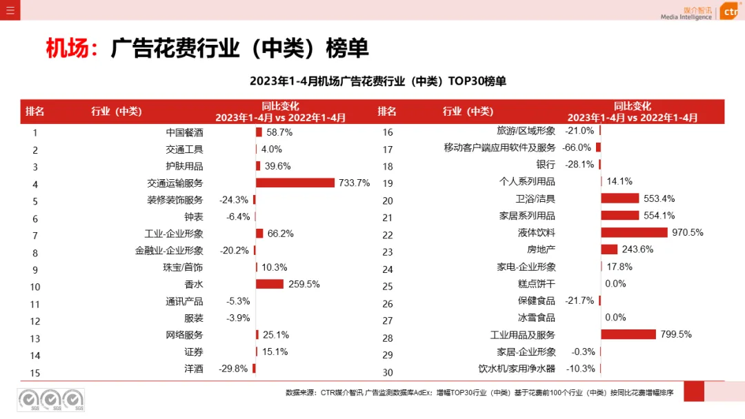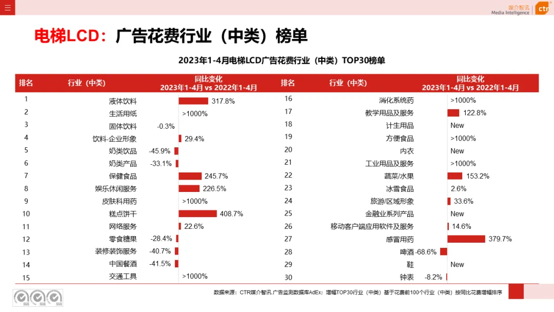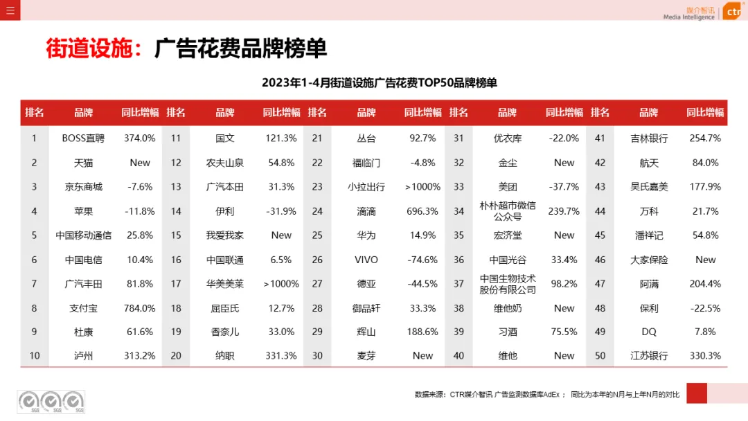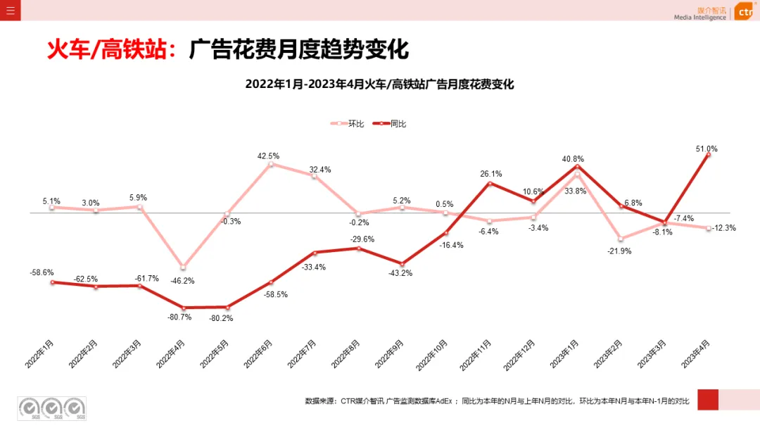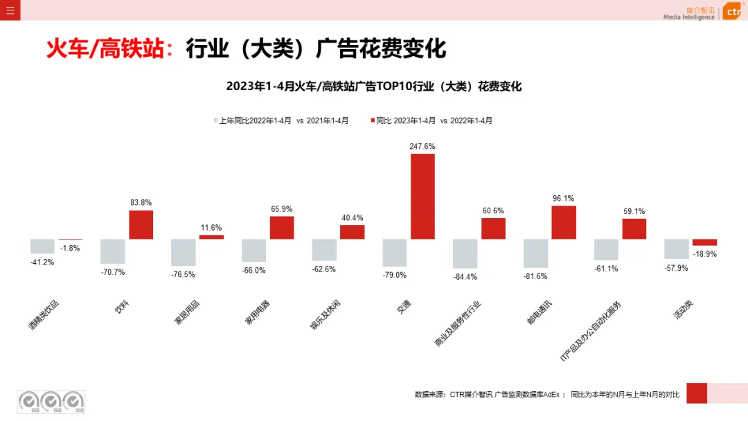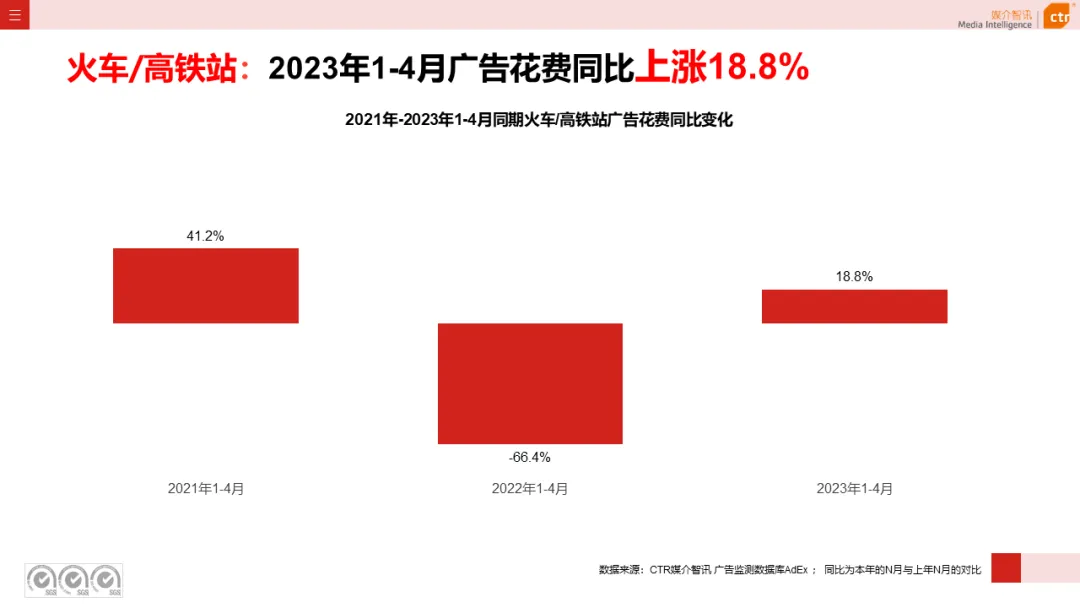 根据CTR媒介智讯户外广告的数据显示,2023年1-4月电梯LCD、电梯海报、火车/高铁站、机场广告同比分别上涨18.1%、13.3%、18.8%和6.0%;其他户外广告渠道均呈现少于10%的花费减少,较去年同期跌幅均明显收窄。