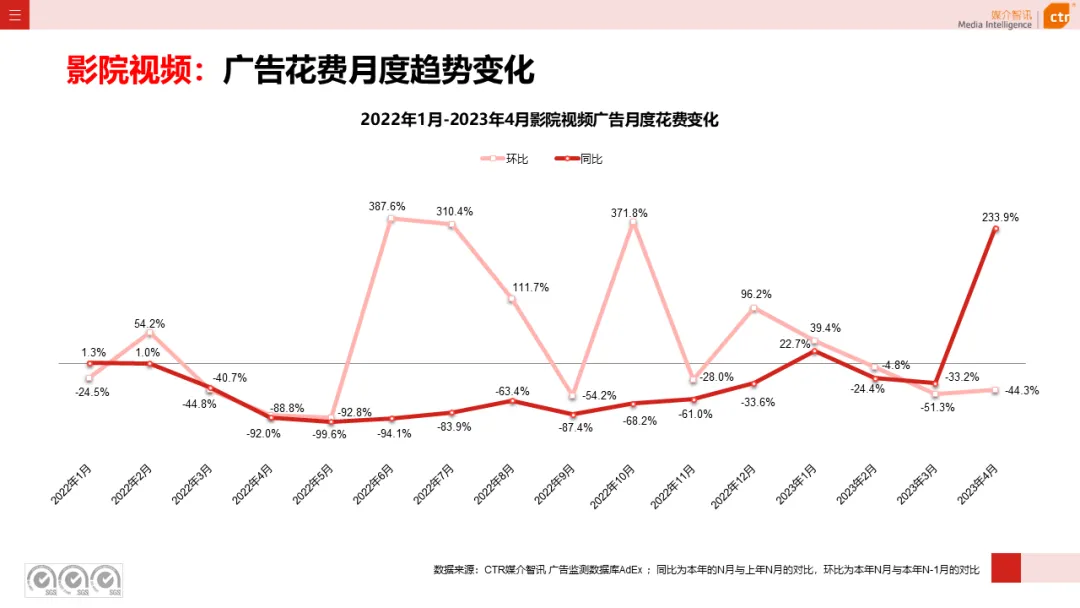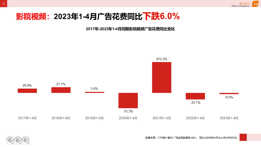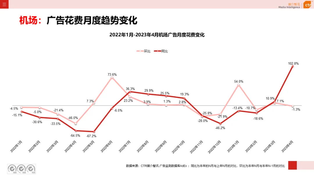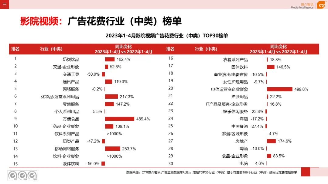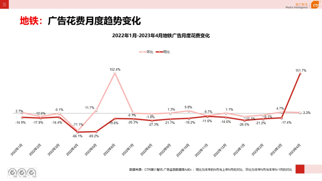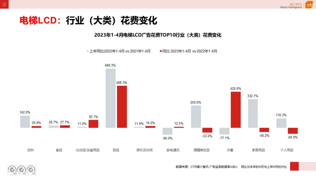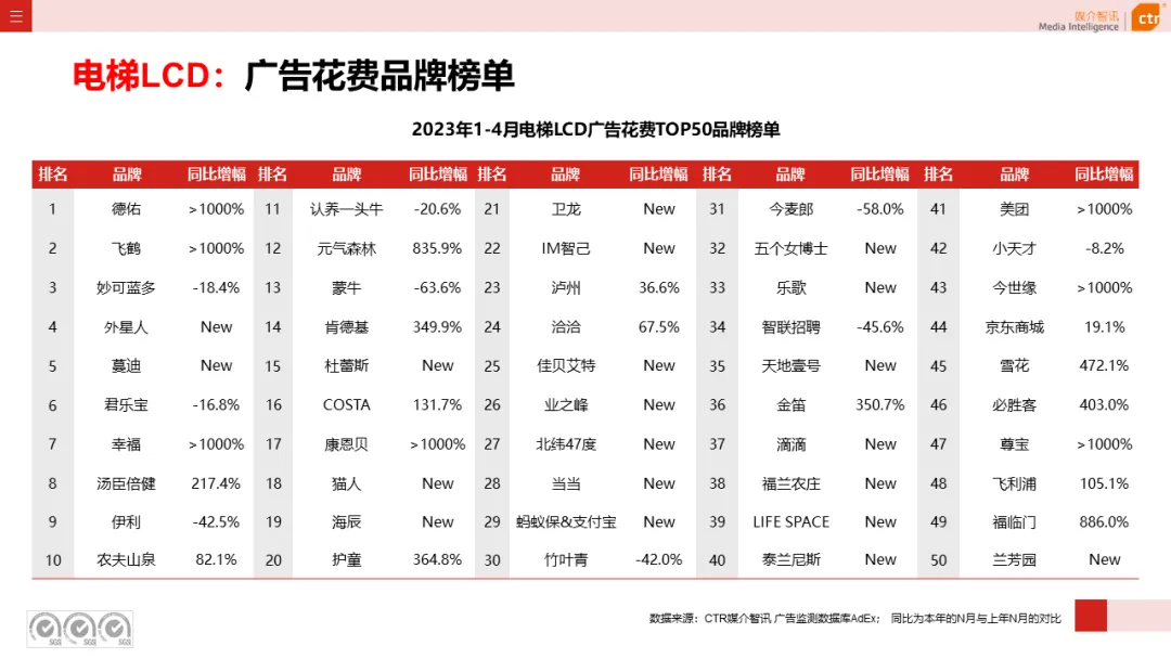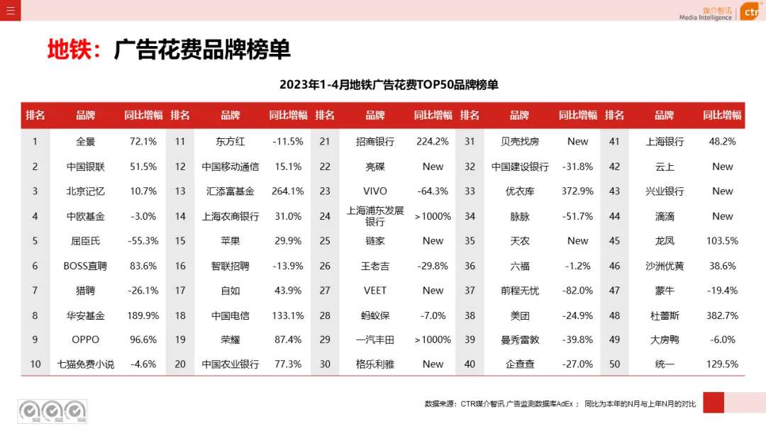 根据CTR媒介智讯户外广告的数据显示,2023年1-4月电梯LCD、电梯海报、火车/高铁站、机场广告同比分别上涨18.1%、13.3%、18.8%和6.0%;其他户外广告渠道均呈现少于10%的花费减少,较去年同期跌幅均明显收窄。