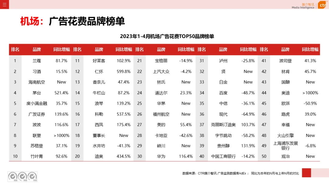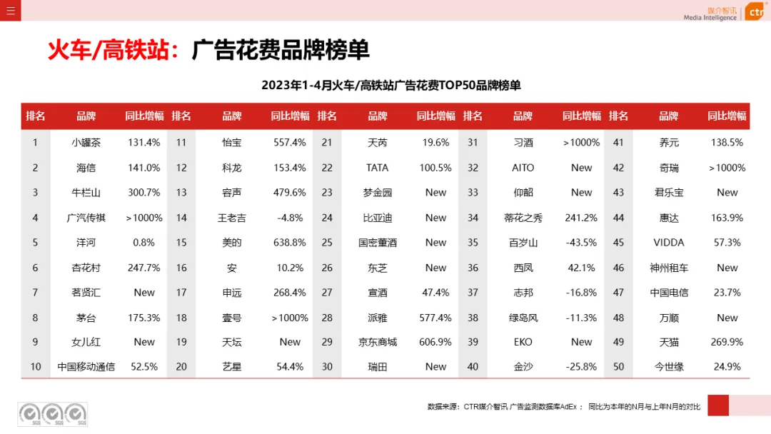 交通行业在整体户外广告投放花费同比增长40.5%,尤其在火车/高铁站和电梯海报表现突出,广告花费上涨均达三位数,主要源于新能源汽车、轿车、速递服务等品类大幅增投带动。该行业头部品牌有IM智己、华晨宝马、飞凡、腾势、红旗等。