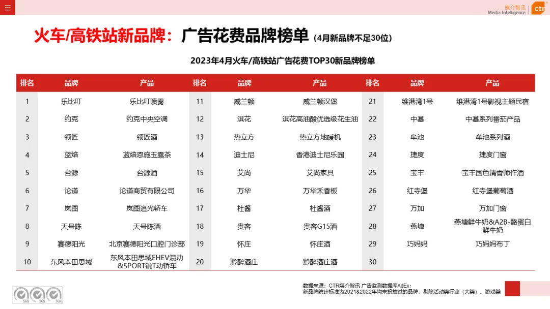 2023年4月新品牌方面,电梯海报的前30个新品牌覆盖11个行业,饮料、IT产品及办公自动化服务、商业及服务性行业的新品牌占比超五成;地铁有四分一的新品牌来自商业及服务性行业、娱乐及休闲行业,其余新品牌覆盖交通、化妆品/浴室用品、金融业等11个行业;街道设施的新品牌覆盖11个行业,超四成源于娱乐及休闲、商业及服务性行业;其他户外广告渠道的新品牌数量都不足30个。