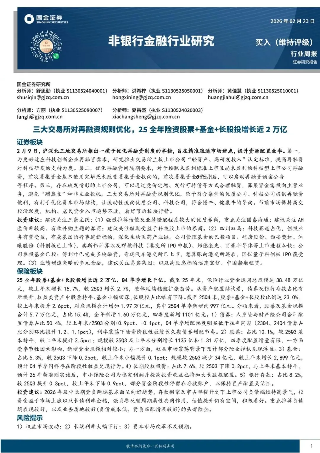 非银行金融行业研究:三大交易所对再融资规则优化,25年险资股票%2b基金%2b长股投增长近2万亿-260223-国金证券-10页