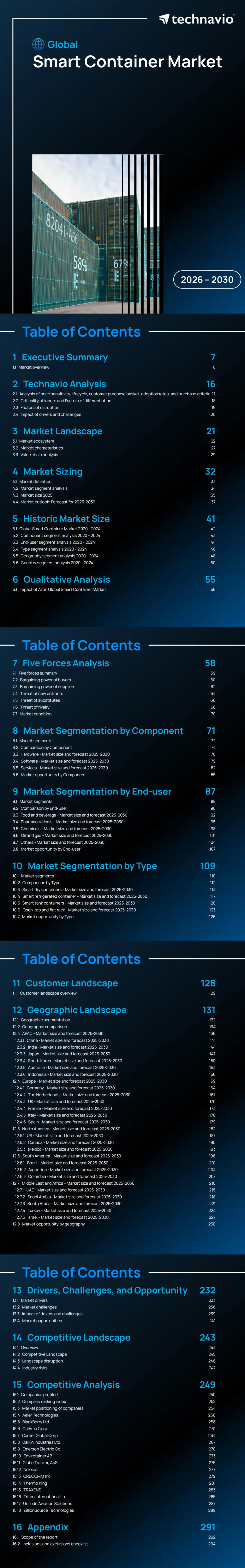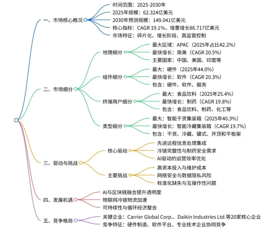 2025-2030 年全球智能集装箱市场呈现加速增长态势,2025年市场规模达62.324亿美元,预计2030年将增至149.041亿美元,CAGR为 19.1%,增量增长86.717亿美元;市场结构呈碎片化特征,APAC是最大且贡献增量最高的区域(占比 42.0%),硬件为最大组件segment(2025年占比 44.0%),食品饮料是最大终端用户segment(2025年占比25.4%),智能干货集装箱为最大类型 segment(2025 年占比 40.3%);增长主要驱动因素包括先进远程信息处理集成、冷链完整性需求升级及 AI 驱动的运营效率优化,同时面临高资本投入、网络安全威胁及标准化缺失等挑战,AI 与区块链融合、智能冷藏集装箱普及成为核心发展机遇。