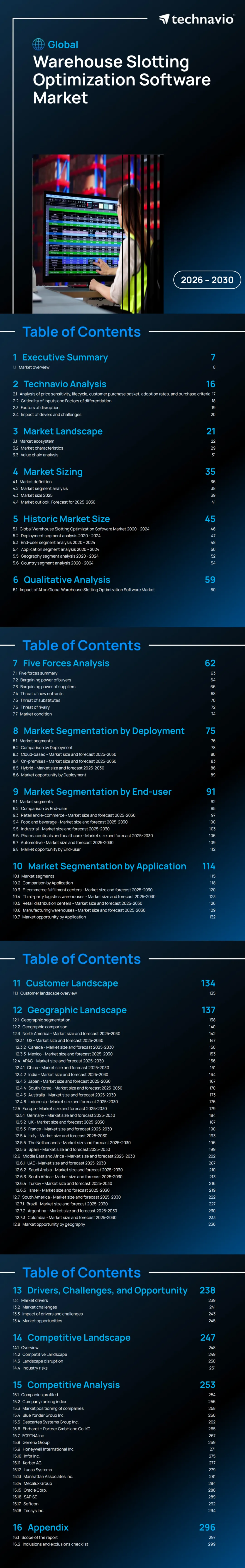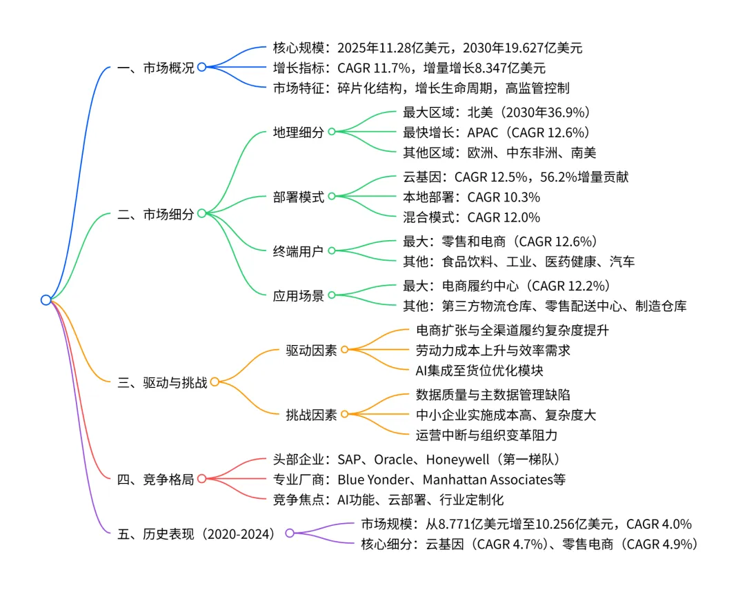 2025-2030年全球仓库货位优化软件市场呈现加速增长态势,2025年市场规模达11.28亿美元,2030 年预计增至19.627亿美元,CAGR 为11.7%,增量增长 8.347亿美元;市场结构呈碎片化,北美为最大区域市场(2030 年占比 36.9%),APAC 为增长最快区域(CAGR 12.6%);部署模式中云基因为最大且增长最快细分(CAGR 12.5%,贡献 56.2% 增量增长),终端用户以零售和电子商务为主(2030 年占比 38.8%,CAGR 12.6%),应用场景中电子商务履约中心占比最高(2030 年 43.0%);市场增长主要受电子商务扩张、劳动力成本上升及 AI 集成驱动,同时面临数据质量、实施成本及组织变革阻力等挑战,竞争格局由SAP、Oracle等巨头及Blue Yonder、Manhattan Associates 等专业厂商主导。