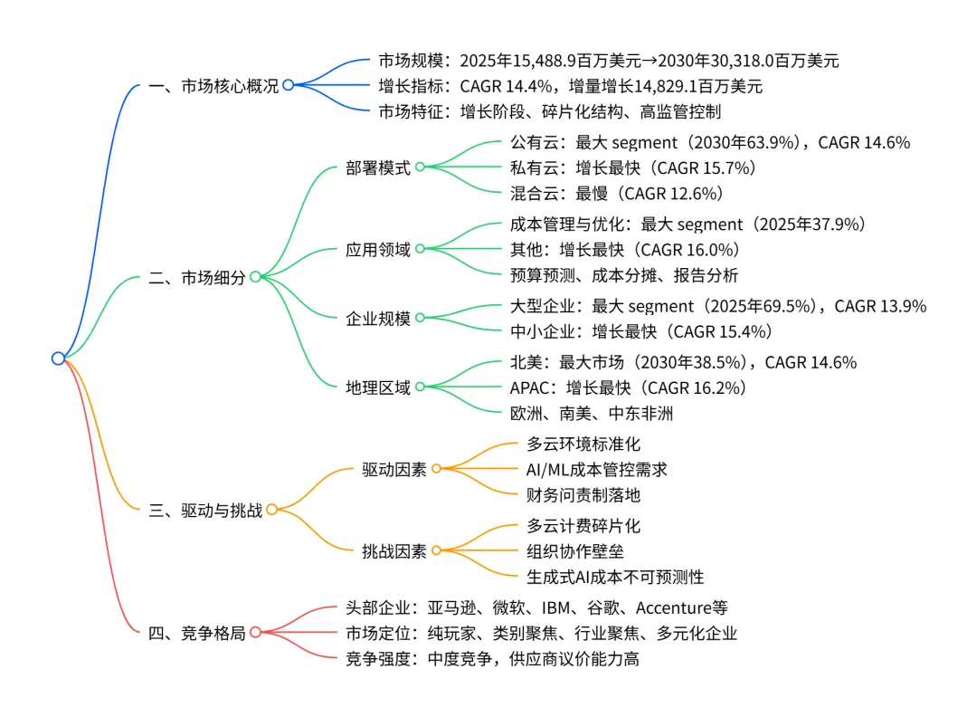全球 Cloud FinOps 市场在 2025-2030 年将保持14.4% 的 CAGR高速增长,市场规模从 2025 年的15,488.9 百万美元增至 2030 年的30,318.0 百万美元,增量增长达14,829.1 百万美元;北美是最大市场(2030 年占比 38.5%),APAC为增长最快区域(CAGR 16.2%);部署模式中公有云占比最高(2025 年 63.3%)且贡献 64.5% 增量增长,私有云增长最快(CAGR 15.7%);应用领域以成本管理与优化为主(2025 年占比 37.9%),中小企业增速(CAGR 15.4%)高于大型企业;市场驱动因素包括多云环境标准化、AI/ML 成本管控需求等,核心挑战为多云计费碎片化与组织协作壁垒,竞争格局呈现碎片化特征,头部企业包括亚马逊、微软、IBM 等。