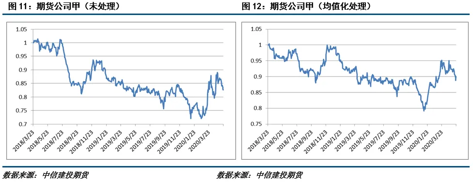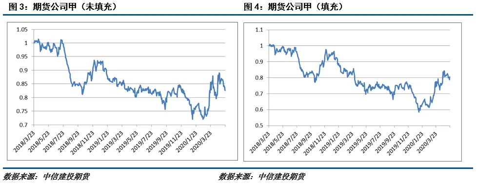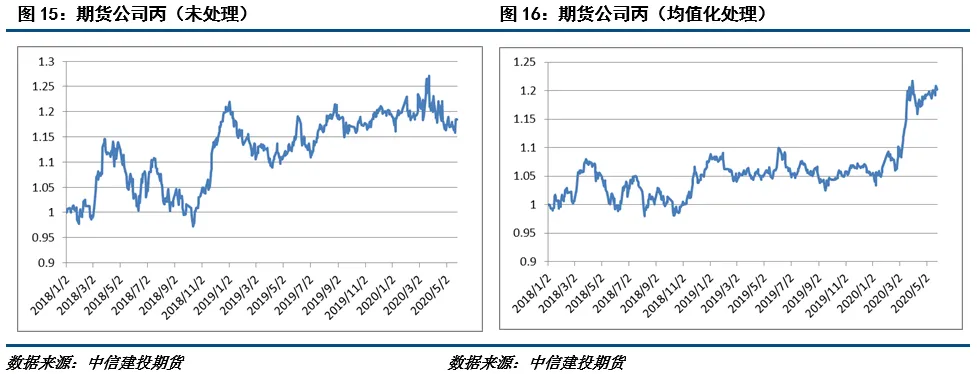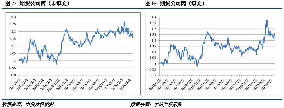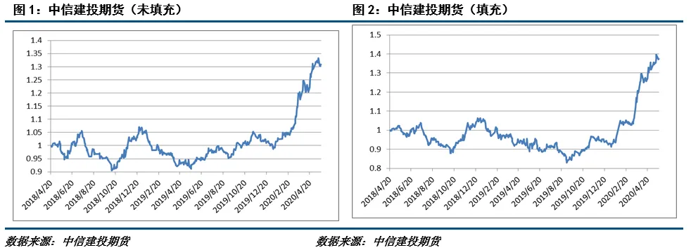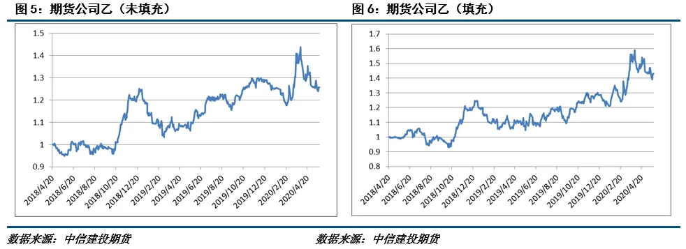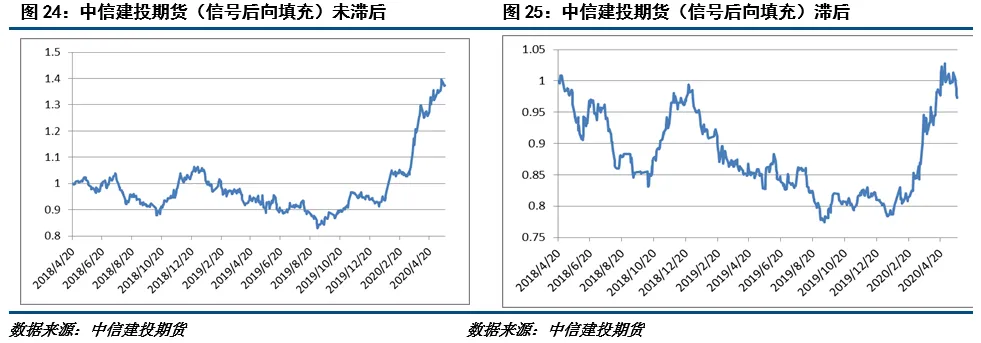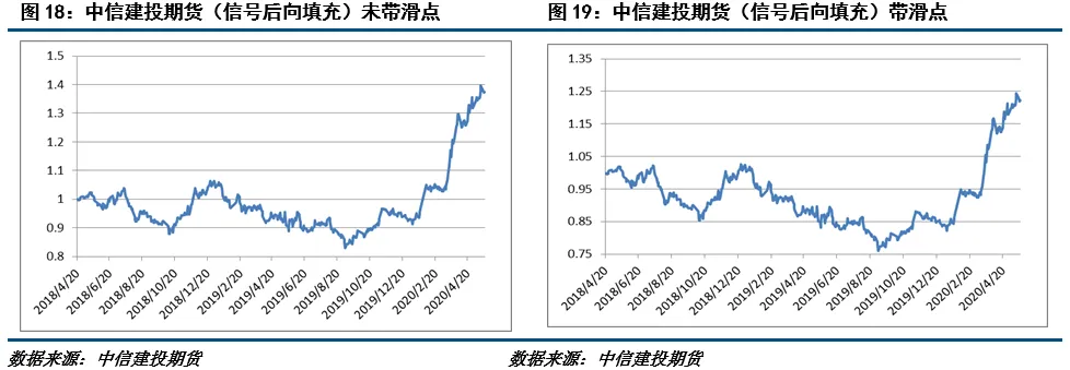 一是,信号后向填充。当每个交易日所交易品种的数据存在缺失时,以该品种最近的多空信号作为当日的信号。在交易信号的处理生成过程中,每个品种的信号并不是连续的。这主要有几方面的原因,其一收集原始数据过程中存在一定缺失,使得该期货公司当日的早报未能及时获取,因此该交易日此公司的所有期货品种的建议均空缺。其二,在对每日的早报数据预处理过程中,我们要求早报至少提到我们构建的“期货品种-名称”字典中的期货名称至少一次,存在研究员所写的品种早报的期货品种名称未在我们字典中,使得该品种当日早报数据空缺的情况。其三,该品种研究员因故未在当日撰写早报,使得该品种当日早报数据空缺。简而言之,当出现该品种该交易日信号为空时,前文中我们采用的方式是平掉该品种当前持仓,这里我们修正为信号后向填充,达到平滑交易信号,降低交易频率的目的。