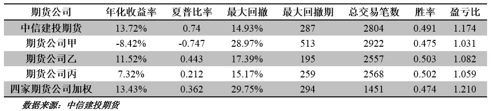 我们按第二部分的思路对四家公司各个研究品种的多空信号进行回测,对比不同方法下各个期货公司的实战绩效。回测参数上也均与前文保持一致。即回测品种为41个品种,回测时间为原始数据的起止时间,测试的杠杆比例为4(即持仓合约总价值为账户资金的4倍),手续费为交易所基础上加10%。