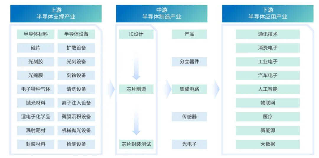 ----半导体产业链比较庞大而精细,上游主要包括半导体材料的制备和半导体制造设备的供应;中游环节是半导体产业链的核心,涉及集成电路的设计、制造以及封装测试;下游应用市场是半导体产业链的最终端,涵盖了消费电子、汽车电子、工业控制、通信设备等多个领域。