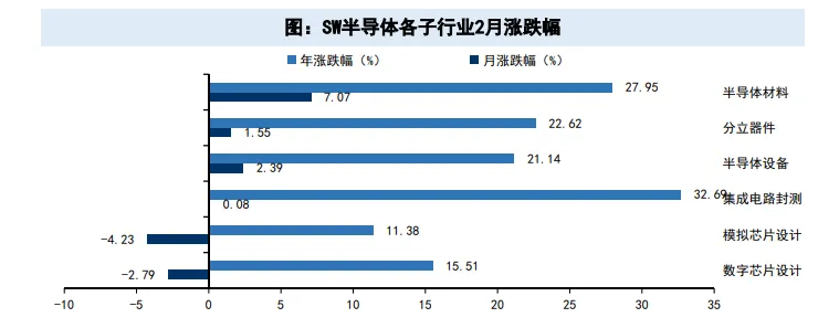 ----2月份数据:半导体材料涨(+7.07%)、半导体设备涨(+2.39%)、分立器件涨(+1.55%)、集成电路封测涨(+0.08%)涨跌幅居前;模拟芯片设计(-4.23%)、数字芯片设计(-2.79%)涨跌幅居后。