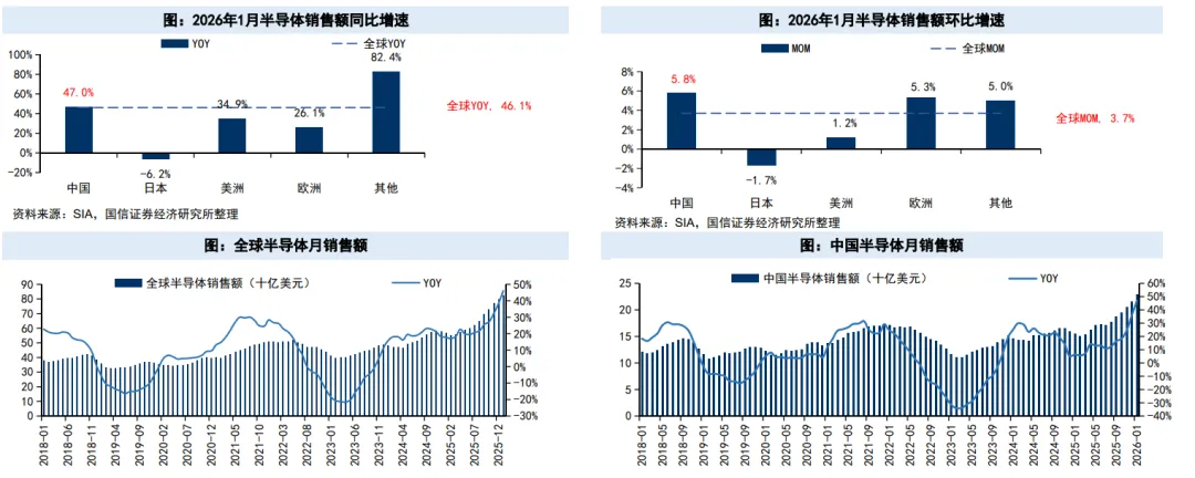 ----半导体销售额:根据SIA的数据,2026年1月全球半导体销售额为825.4亿美元(YoY+46.1%,Q00+3.7%),连续27个月同比正增长;分地区来看,其他地区、中国销售额同比增速为+82.4%、47.0%,高于全球平均增速;美洲、欧洲、日本同比增速分别为+34.9%、+26.1%、-6.2%低于全球平均增速。
