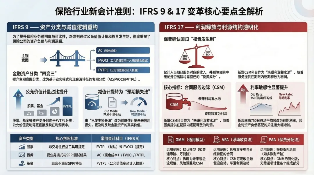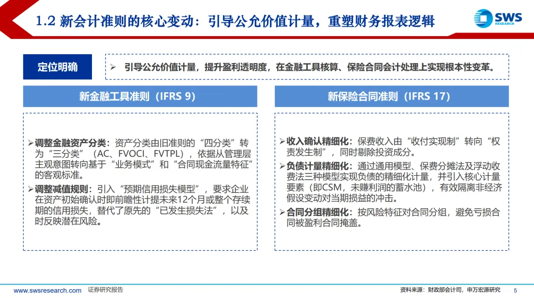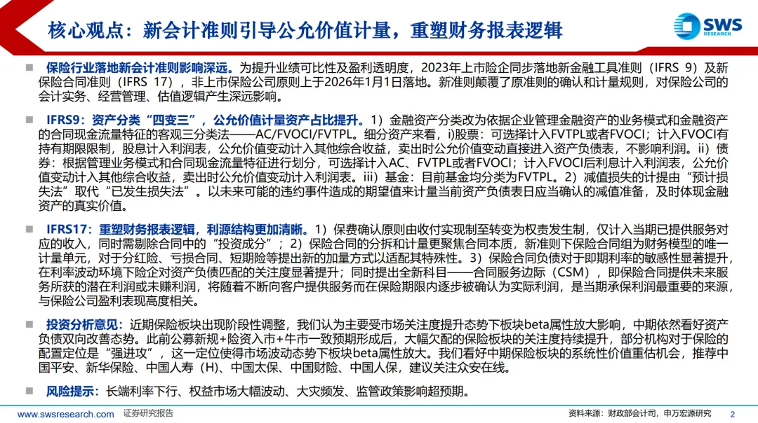导语:各位保险业的同仁,大家好。 如果你在上市险企工作,那么在过去三年里,你一定已经深刻感受到了新会计准则(IFRS 9 和 IFRS 17)给公司从底层数据、精算模型到前端产品设计、甚至考核体系带来的“巨震”。而对于非上市险企的同仁们而言,距离2026年1月1日全面落地的“大限”已不足两年。这份由申万宏源证券最新发布的《如何理解保险行业新会计准则的变化?——保险行业研究“红宝书”系列之一》,作为一份行业内部视角的实操指南来研读,你会发现,新准则不仅是对财务报表的重塑,更是对保险公司经营逻辑、产品策略和资产负债管理(ALM)的全面洗牌。