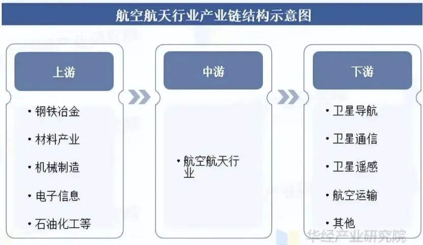 从产业链角度看,航空航天产业链涉及众多环节,包括设计、研发、制造、测试、运营等,各环节之间相互关联、相互依存。产业链上游包括钢铁冶金、材料产业、机械制造、电子信息以及石油化工等行业;下游包括卫星导航、卫星通信、卫星遥感、航空运输等领域。