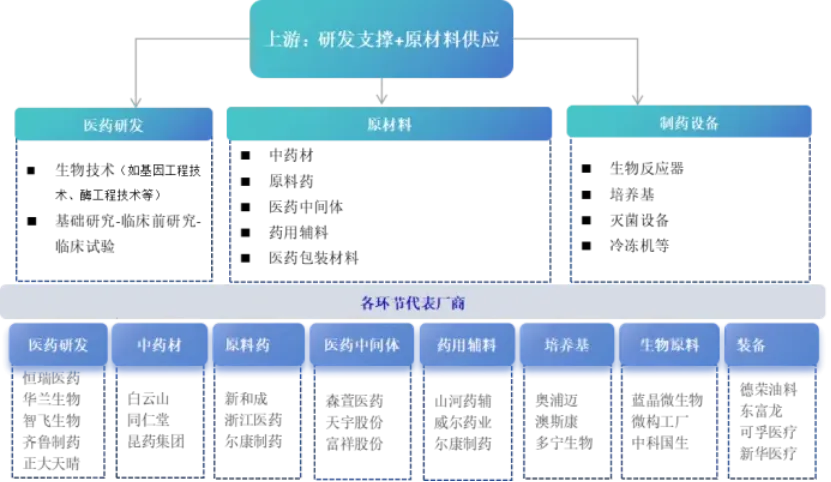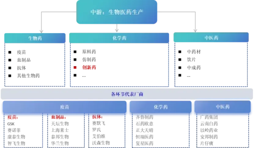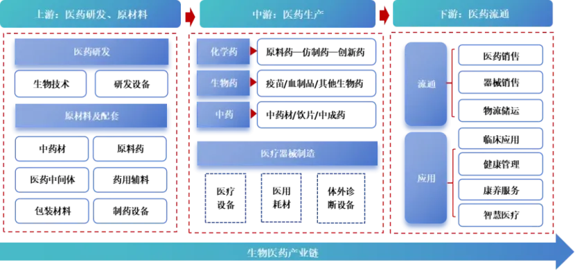 生物医药产业链上游为研发、原材料及装备,包括中药材、医药中间体、药用辅料、医药包装材料、制药设备、医药研发;中游为生物医药生产,包括各类生物药、化学药、中医药等;下游药品流至各种线下渠道及线上渠道,最终到终端消费者手中。