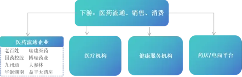 下游:医药流通消费。下游主要是医药的销售和消费,是产业链变现通道,主要包括包括医药批发市场、医药零售市场两个部分,医药零售包括公立医院、公立基层医疗机构和零售药店。