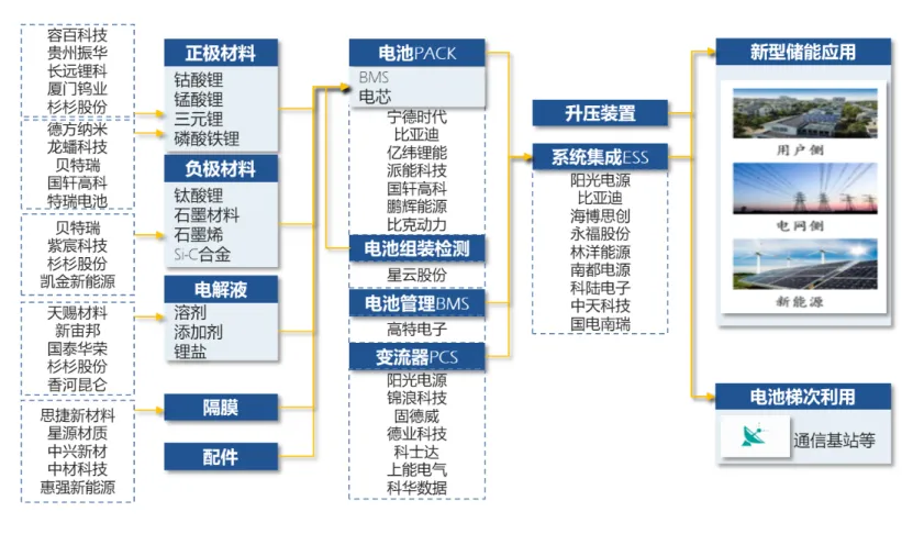 新型储能产业链上游为储能电池、储能变流器(PCS)、电池管理系统(BMS)、能量管理系统(EMS)、空气压缩机、换热器、膨胀机、制氢等原材料及核心设备供应;中游为储能系统的集成,包括电化学储能、压缩空气储能、飞轮储能、超级电容、储氢、热储能等;下游为储能系统的应用,分为发电侧、电网侧、用户侧。