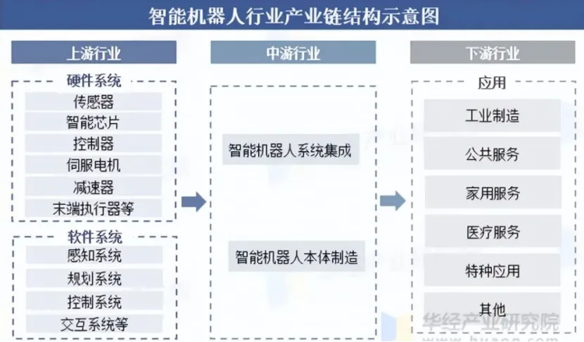 智能机器人产业链的完善和协同发展,是推动智能机器人技术进步和市场拓展的关键。智能机器人产业链上游包括传感器、智能芯片、控制器、伺服电机、减速器等硬件系统以及感知系统、规划系统、控制系统、交互系统等软件系统;中游为智能机器人的本体制造及系统集成环节;下游应用场景广泛,包括工业制造、公共服务、家用服务、医疗服务、特种应用等各个领域。