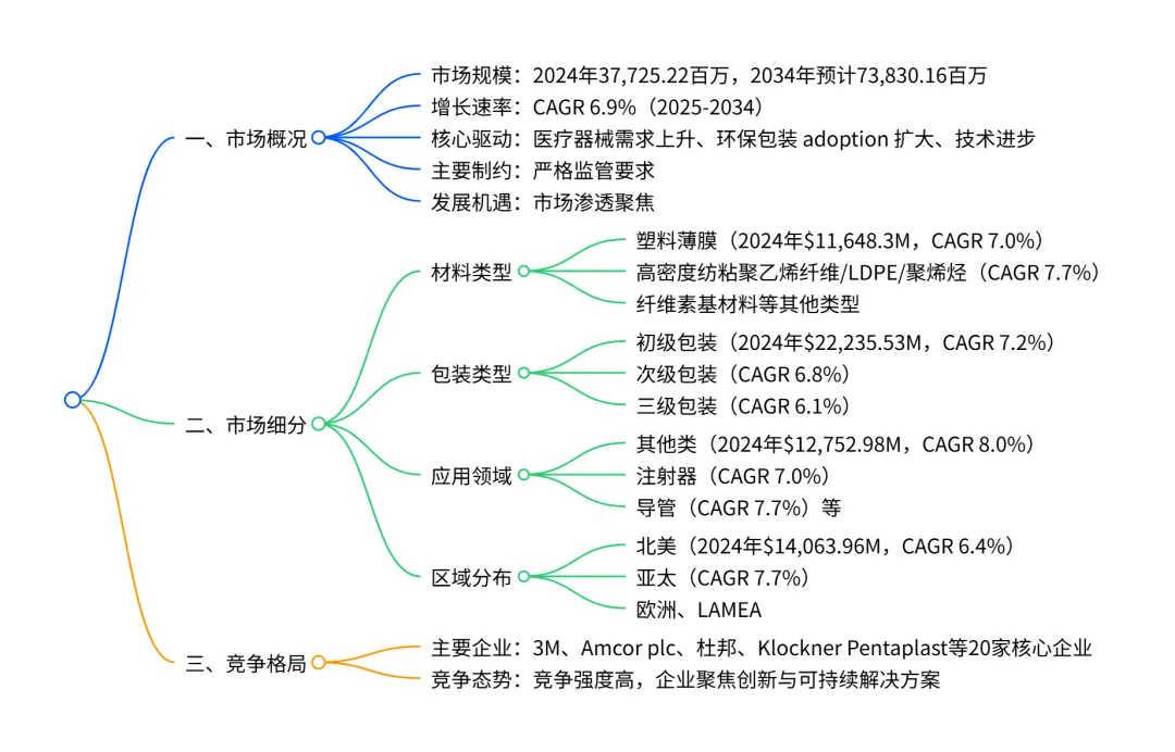 2024-2034 年全球医疗器械包装市场呈现稳健增长态势,2024 年市场规模达$37,725.22百万,预计2034年将增至$73,830.16 百万,CAGR 为 6.9%。市场增长主要受医疗器械需求上升、环保包装 adoption 扩大、包装技术进步驱动,同时面临严格监管的制约,而市场渗透聚焦则带来新机遇。按材料类型,塑料薄膜是 2024 年最大细分市场($11,648.3百万),高密度纺粘聚乙烯纤维/LDPE/聚烯烃增速最快(CAGR 7.7%);按包装类型,初级包装占比最高(2024年$22,235.53 百万,CAGR 7.2%);按应用,其他类(含植入物、手术套件等) 主导市场且增速最快(CAGR 8.0%);区域方面,北美是 2024 年最大市场($14,063.96 百万),亚太地区增速领先(CAGR 7.7%),主要参与者包括 3M、Amcor、杜邦等企业。