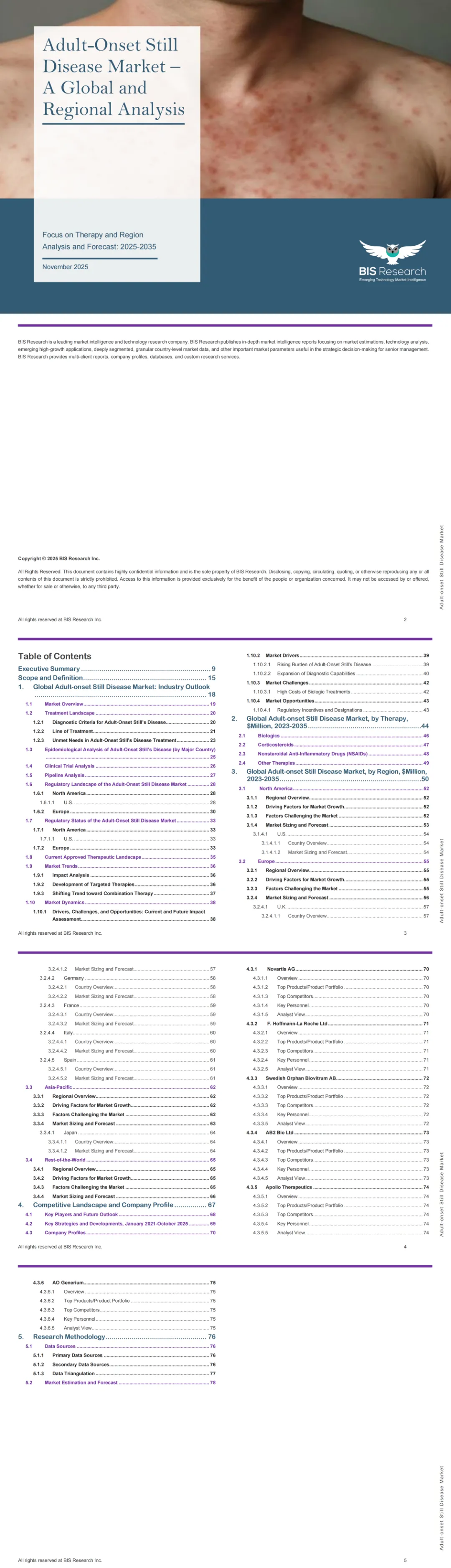 这份由 BIS Research 发布的《成人起病斯蒂尔病市场全球及区域分析(2025-2035)》报告,聚焦该罕见全身性自身炎症性疾病的治疗市场,从市场规模、驱动因素、治疗格局、区域分布、竞争格局等多维度展开分析,核心结论与关键内容总结如下: