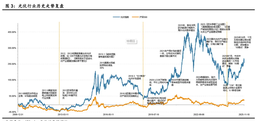 2025年1-11月,光伏产业指数期间收益率达21.53%,大幅跑赢沪深300指数(13.18%)。电力设备及新能源板块在中信一级行业中排名第3名,涨幅达33.34%。