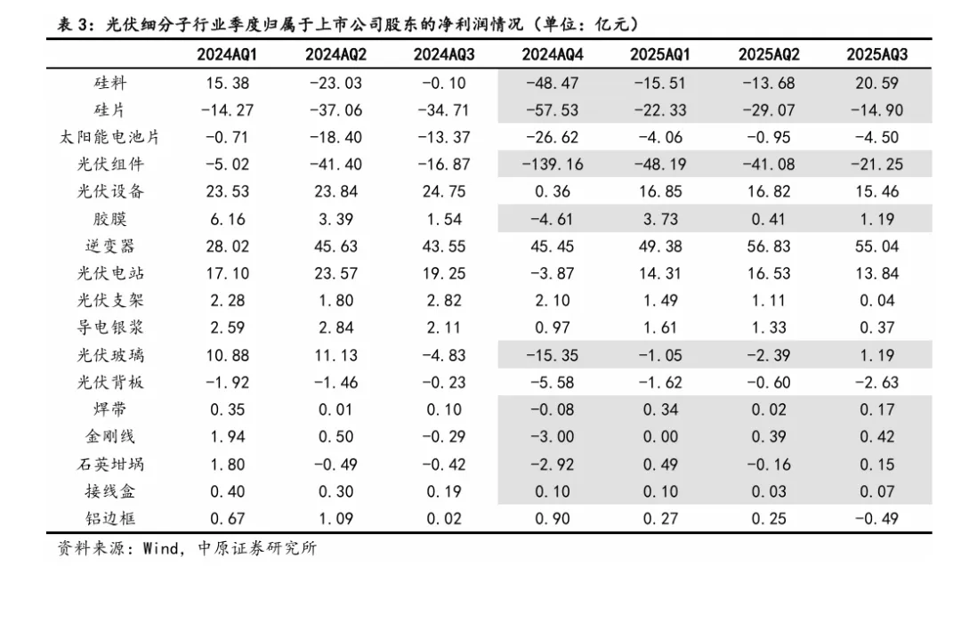 分季度看,光伏板块净利润自2024年四季度大幅亏损以来,已呈现逐季度好转态势。主要原因包括: