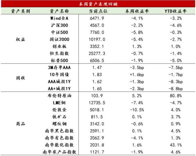 【股票】本周美伊冲突加剧能源紧张局势,通胀担忧提振全球加息预期,流动性收紧预期下大类资产剧烈波动,美股三大指数全线下跌;国内方面,1-2月主要经济指标回升,A股受风险偏好和流动性预期影响更甚,上证指数失守4000点。两市日均成交缩量3000亿至2.2万亿附近,避险观望情绪上升。融资余额小幅下降至2.63万亿。除创业板外宽基指数全线下跌,大盘相对抗跌,小微盘跌幅居前。上证50、沪深300跌幅约2%,而中证500、中证1000、中证2000下跌5-6%,微盘股大跌超7%。创业板受光模块和新能源带动,逆势新高,周涨幅1.26%。申万一级行业仅通信和银行收红,食品饮料、公用事业、煤炭相对抗跌。科技成长相对强势,周期板块承压,有色金属、基础化工、钢铁跌幅均在10个点以上。港股市场先扬后抑,后半周在伊朗战局升级,以及美联储降息预期修正的双重影响下再度下挫。当周恒生指数下跌0.74%,恒生科技下跌2.12%。南向资金周四单日净买入230亿元后,周五单日净卖出184亿元,全周净卖出55亿元,AH溢价降至120附近。短期来看,美伊冲突仍是全球资产的主要定价锚,而海外主流权益资产或仍未充分定价战争影响。中长期看,中国资产尤其是先进制造仍具有较高配置价值,但短期由于估值在中等偏高位置,受流动性和风险偏好影响更大,局势明朗前波动仍将延续。此外,临近一季报、年报披露期,需要警惕流动性收紧下绩差股带来的踩踏下跌。