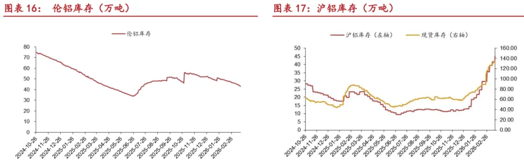 ----铝:库存累积叠加滞胀交易,铝价承压调整,但铝相比于铜在供给端逻辑更顺畅。1)氧化铝:运行产能下降叠加原料成本上升,氧化铝价格回升,全国氧化铝库存小幅反弹。2)电解铝:库存累积叠加滞胀交易,铝价承压调整。本周沪铝下跌5.20%。库存方面,国内库存持续累积,国内现货库存为133.90万吨,环比增加3.48%。短期看,美伊战争导致的中东电解铝出口受阻和减停产仍对铝价具备支撑作用,但库存累积叠加滞胀交易,铝价承压调整,但铝相比于铜在供给端 的逻辑更顺畅。中长期看,供给端,国内电解铝运行产能接近天花板,海外在建项目进度缓慢,而需求端维持稳定增长甚至存超预期可能,电解铝今年或出现短缺格局,铝价有望迎来上行周期。