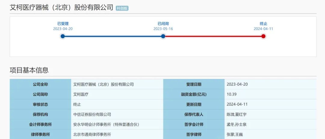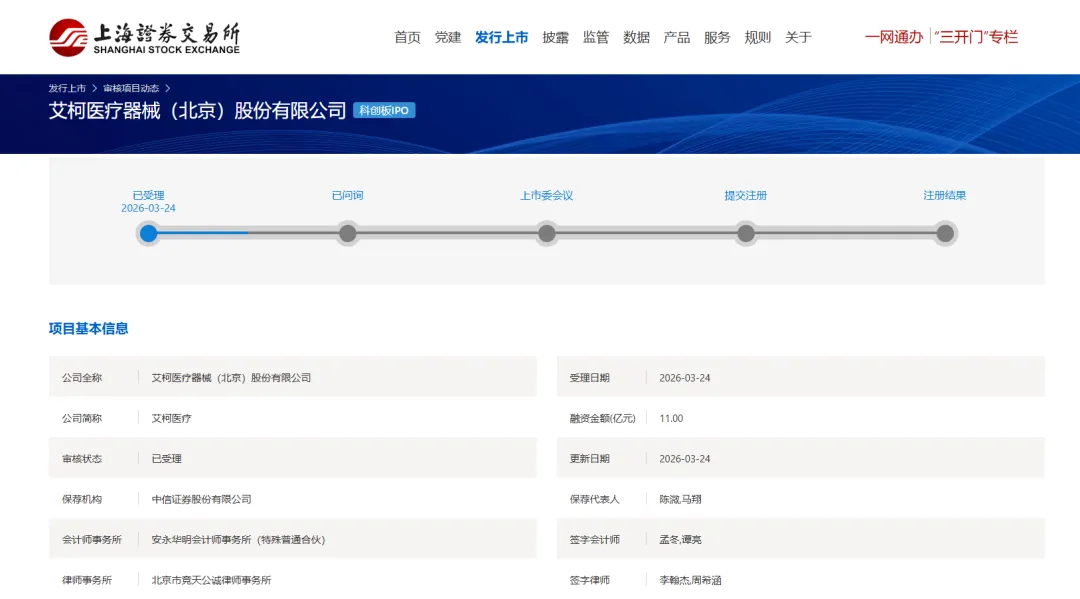 2026 年 3 月 24 日,北京春日的风刚吹暖科创圈,艾柯医疗器械(北京)股份有限公司的科创板 IPO 申请便获上交所受理 —— 这是这家国家级专精特新 “小巨人” 时隔两年,再次向科创板发起冲击。