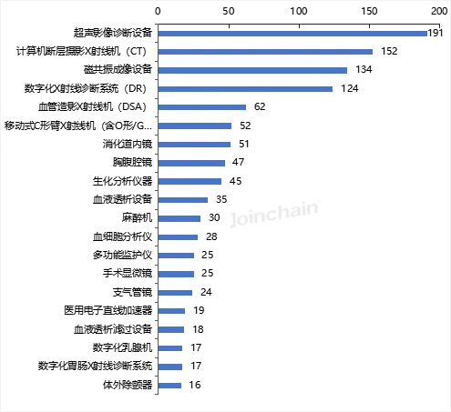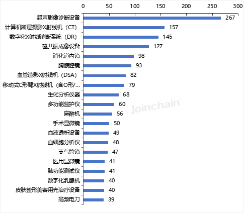 从产品类别来看,2025年全国设备采购意向覆盖品种共322种。其中影像类设备需求最为突出,超声影像诊断设备以267个项目位居首位,CT、DR、MR项目数均超120个;同时消化道内镜、胸腹腔镜、生化分析仪器等品类项目数也相对较高。
